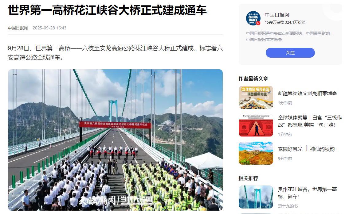 中国又一项世界第一面世,世界发出惊叹,美国回头看看自己的高铁:欲哭无泪! 9月28日,贵州花江峡谷大桥正式建成,一经完工就凭着“主桥跨径、桥面高度双世界第一”在世界频道刷屏。 这座大桥在“地球裂缝”花江大峡谷上架起 2890 米的桥,625 米高相当于 200 多层楼,开车过峡谷从 2 小时缩到 2 分钟,这哪是基建,简直是“云端奇迹”! 美国人再回头看看自己的高铁,那真是想死的心都有了。 就说美国喊了十几年的加州高铁,2008 年就说要建,号称“连接洛杉矶和旧金山”,结果呢?预算从 330 亿涨到 1000 多亿,工期拖了十几年,至今连十分之一都没修完。 更离谱的是,规划的最高时速才 350 公里,还没咱中国普通高铁快,去年甚至被曝 “部分路段只能跑 160 公里”,网友都调侃 “这叫高铁?不如叫‘高速大巴’”。 反观咱花江峡谷大桥,2022 年开工,三年多就通车,悬崖峭壁上搞毫米级精度施工,抗风、吊装全是世界级技术突破,光专利就拿了 21 项。 不是咱吹,中国基建就是有这股子 “说到做到、做到最好” 的劲儿! 更绝的是咱建桥不光 “能通”,还能 “好玩”“赚钱”! 桥上搞高空秋千、竞速跑道,站在观光电梯里看云雾绕桥墩,以后还要开缆车、建主题民宿,直接把大桥变成 “网红打卡地 + 赚钱机器”。 沿线老乡的橘子、茶叶再也不用烂在山里,两分钟过峡谷,拉到城里新鲜又好卖;民宿餐馆天天爆满,老板们笑开了花。 可美国加州高铁呢?钱砸了上千亿,连影子都没见着,当地老百姓吐槽 “税交了不少,路还是堵得要死”,纯属 “烧钱不办事”。 其实这反差早不是第一次了,美国搞基建,要么规划画大饼,要么建着建着就超支、停工。 咱中国不一样,从港珠澳大桥到北盘江大桥,再到现在的花江峡谷大桥,越是难啃的 “硬骨头”,越能搞出世界级成果。 就说花江大桥那施工环境,600米高空作业、峡谷风刮得人站不稳,咱建设队愣是搞出智慧吊装设备,在云端“穿针引线”,还把抗风板改成竞速跑道,这脑子、这魄力,美国真得学学! 更实在的是,咱的基建从来都是 “为人民服务”。 大桥一通,贵阳、安顺、黔西南城市群串成 “1 小时圈”,农产品、旅游资源全盘活,老百姓实打实得实惠。 可美国加州高铁,折腾十几年只听见 “画饼”,连当地居民都喊 “不如把钱花在修公路、建医院上”。 现在再看花江峡谷大桥,它不光是两座悬崖间的通路,更是中国基建 “又快又好、惠民实用” 的活名片。 对比美国高铁的 “拖沓低效”,咱这 “双世界第一” 来得干脆、来得实在。 说到底,基建拼的不是口号,是真本事、真担当 —— 中国能在峡谷里架起 “通天桥”,能让老百姓走得快、过得好,这就是最硬的底气! 看着美国高铁还在 “画饼”,再瞧咱贵州大桥上车水马龙、游客爆满,这股子自豪劲儿,真是越想越解气!