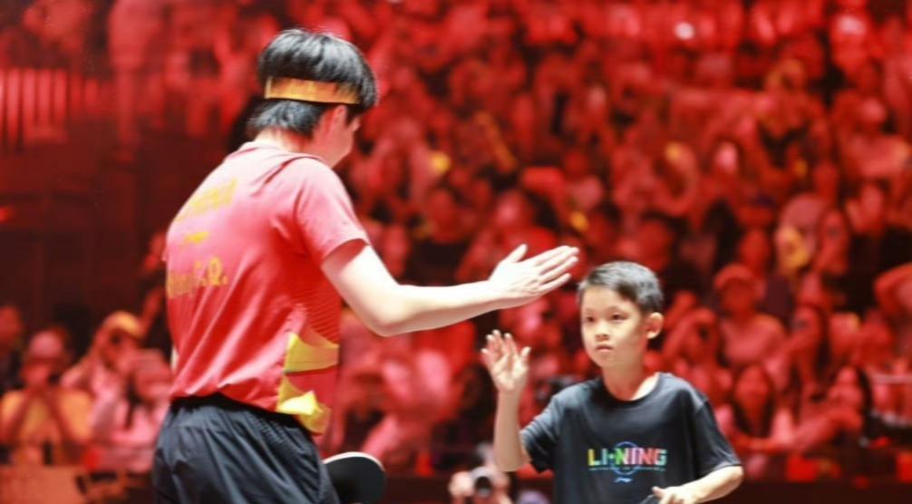 图中这个与王楚钦击掌的小男孩,大家认出他是谁吗? 昨日中国大满贯赛男单正赛首轮,