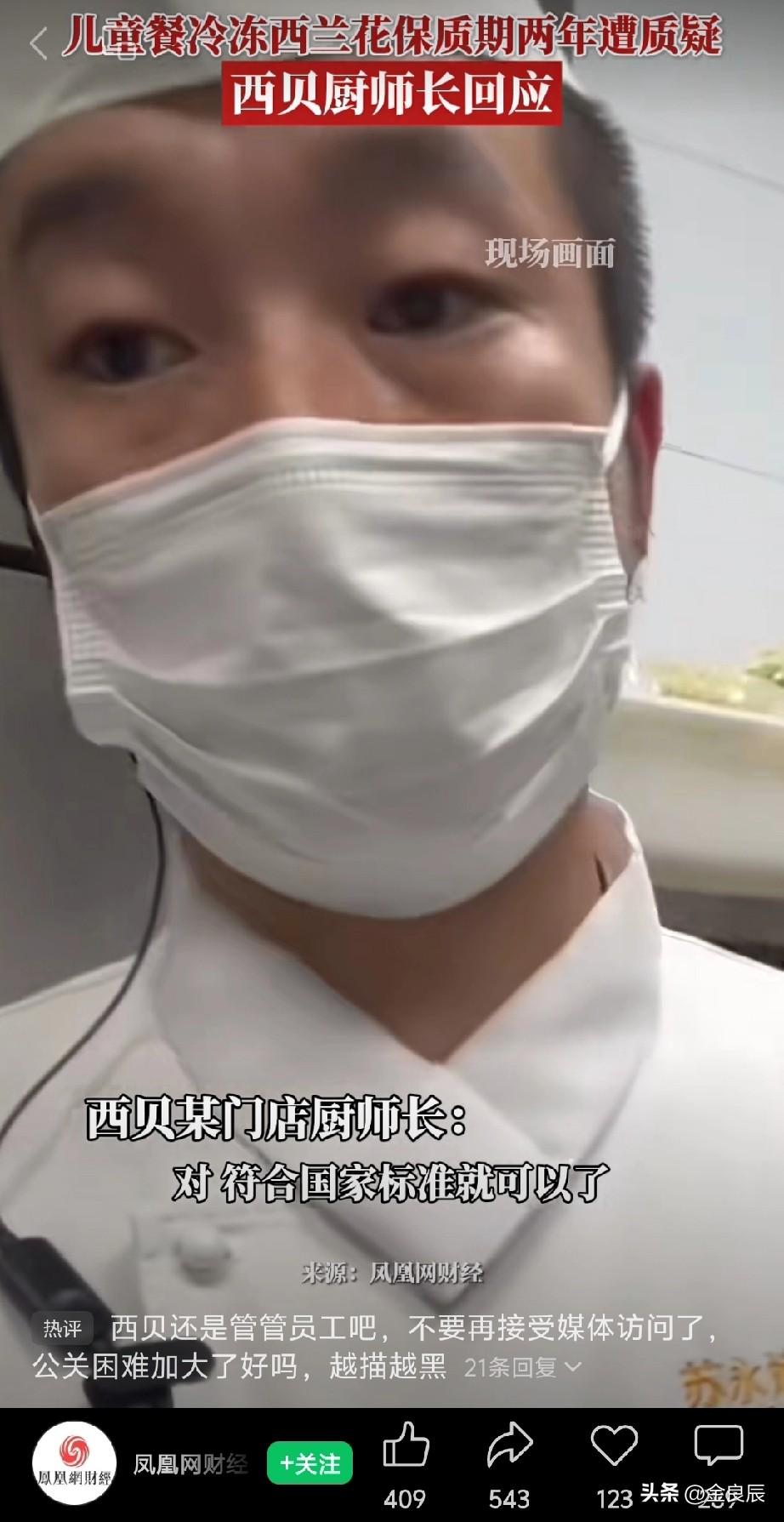 西贝的这个厨师长可以下岗了! 从西贝莜面村9月12日开放全国370家门店后厨接受社会监督开始,西贝的败局和崩塌已经注定。 有媒体记者在9月13日走访西贝某门店时,拍到其后厨冰箱储藏的袋装有机速冻西兰花,保质期竟然长达24个月。这可是西贝儿童餐的必选用料,难怪网友调侃说,在西贝可以吃到比自己年龄还大的菜品,堪称餐饮界的奇迹! 该门店厨师长面对镜头的解释原话是:每个原料跟每个原料储存的时间,和加工的东西都会不一样,可能它的生产工艺也会有不同。根据它生产的原料的新鲜程度,食材储存的温度,和每个原料的时间是不一样的,保质期的时间也是不一样,符合国家标准就可以了。 我仔细看了记者拍到的这袋速冻西兰花外包装上的产品信息,发现它标明的“产品标准代号”是Q/STY0005S。按照我国《食品安全法》规定,这个代号其实是“企业标准”的简称。 《食品安全法》第三十条明确规定,国家鼓励食品生产企业制定严于食品安全国家标准或者地方标准的企业标准,在本企业适用,并报省、自治区、直辖市人民政府卫生行政部门备案。也就是说,企业标准的产品应该是比国家标准的产品质量更过硬更让消费者放心的产品。 其实不然。我上网查了这个有机西兰花的标准代号信息,显示被授权企业的确是山东泰安泰山亚细亚食品有限公司第三加工厂,但重要的一点是,这个授权企业标准代号是有有效期限的,许可有效期至2024年6月2日。超过这个有效期即视为无效,该日期之后生产的仍标有这个标准代号的速冻果蔬制品可认定为不合格食品。除非这家生产企业在该日期之前向有关主管部门申请并获批了延续,或者申请了新的标准代号。 目前我没有看到媒体曝光的这袋西兰花的具体生产日期,所以无法判定这家西贝莜面村门店的储藏食品是不是属于过期产品或不合格产品。 如果真的是不合格食品,西贝的自爆就变成自我检举,属地市场监管部门可以依据《食品安全法》有关条款处罚它了。 “西贝”是创始人贾国龙姓氏“贾”的拆解,也表明了它的品牌源发地是贾老板的出生地我国西北地区内蒙古,还有西贝餐饮主打西北菜的寓意,三意齐聚,37年做到了中国餐饮界的顶流,不容易。这一回,就看它的造化了。