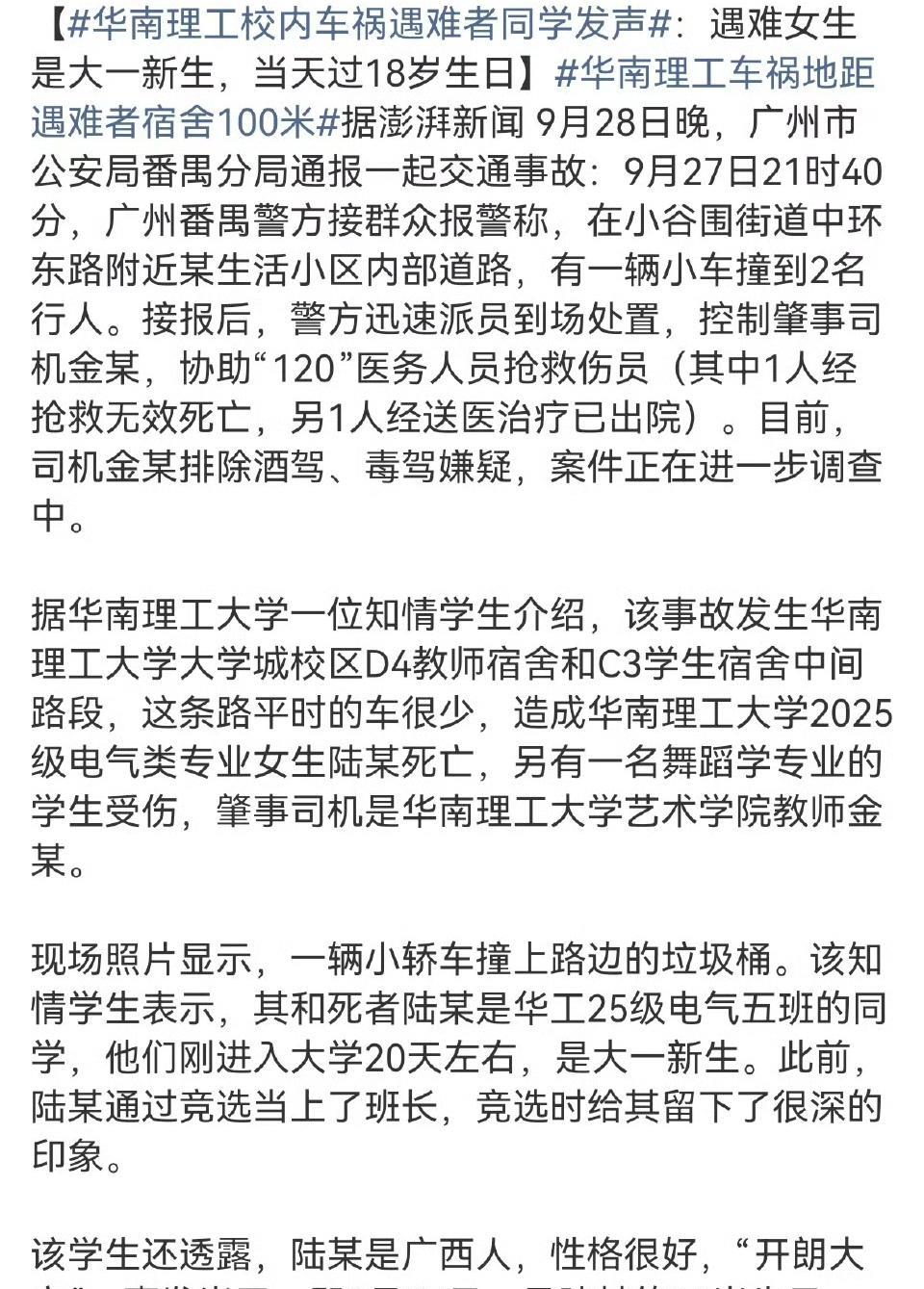 还没有摁下“出轨门”的葫芦,马上又起了校内撞人的瓢,华南理工大学最近麻烦不断。 9月27日晚间,在华南理工大学大学城校区教师公寓,发生一起交通事故,一名艺术学院的老师,在开车过程中撞到两名学生,其中一人抢救无效死亡,另一人受伤。 看了这位去世女生的遭遇,尤其让人心痛。这是多么优秀的一个孩子啊。作为广西考生,能够考到华南理工大学这所985知名高校,而且还是颇为热门的电气类专业,估计分数要在640分左右,放在广西差不多也要在千名之内了。 华南理工大学是9月8日开的学,也就是说,该女生的大学生活才过了21天。这位女生,还是班里的班长。这么优秀的孩子,历经12年的寒窗苦读,好不容易如愿到了象牙塔,还没来得及好好体验美好的高校生活啊。 悲上加悲的是,当天正是这位女生的18岁生日,她的生命永远定格在了18岁。充满希望和美好的人生,刚刚开始便戛然而止,过早的凋落了。 开车能够致人死亡,足以说明当时的车速会很快,如果保持在四五十迈的话,即便撞到人最多也就是受点外伤,不会有生命危险。那么问题来了,肇事者车速为何如此之快?任何学校,对于校内车速都有严格的管理要求,尤其是车速有明确限制,这位肇事老师是否严格遵守?发生事故的地方,是在教师公寓和学生公寓附近,是人员比较集中的区域,肇事老师为何如此麻痹? 有人说,学校内不应该允许开车,其实这不是关键原因,现在的高校校园,就是一个小城市般的存在,动辄数千甚至上万亩,学习和生活区域范围很大,不开车也不现实,关键是如何管理,近几年,校园内偶有开车撞人事故发生,如何进行人车分流保障安全需要认真对待。 #头号创作者激励计划#