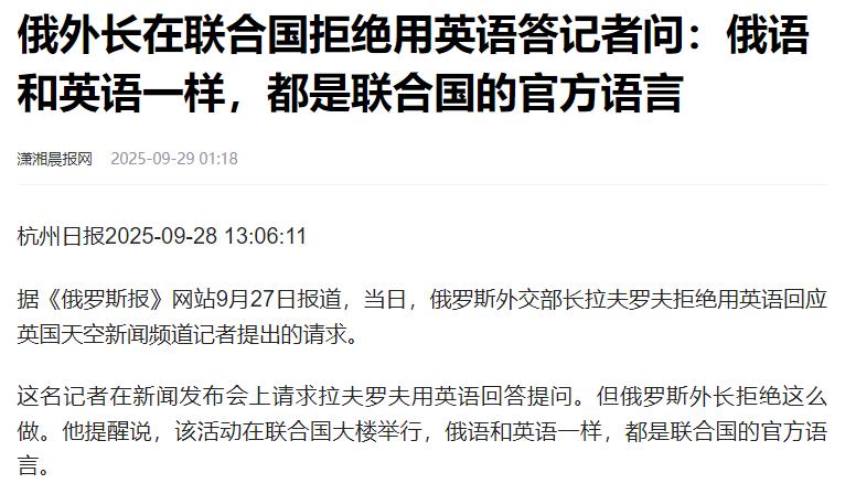 俄罗斯确实霸气,俄罗斯外交部长拉夫罗夫在联合国大会发言,拒绝了使用英语回答问题。拉夫罗夫表示,所有人都不要忘记,在联合国,俄语也是官方语言,与英语的地位是一样的。 9月27日,拉夫罗夫正在联合国大楼内召开新闻发布会,英国天空新闻频道的记者突然提出要求,让他用英语回答问题。 面对这个不太合理的请求,拉夫罗夫直接回了句“这里是联合国”,接着强调“俄语和英语一样,都是联合国的官方语言”,最后坚持用俄语完成了回应。他这番话不光是守住了自己国家的语言尊严,更点出了联合国这个国际组织最核心的平等原则。 拉夫罗夫这么做可不是随口一说,而是有实打实的规矩撑腰。联合国早就定下了《大会议事规则》,里面第五十一条明确写着,阿拉伯语、中文、英语、法语、俄语和西班牙语这六种语言,都是大会和各个委员会的正式工作语言,在联合国里地位完全平等。 制定这个规矩就是为了不让某一种语言“独大”,保证不管来自哪个国家、哪种文化的代表,都能站在平等的位置上讨论国际大事。 在联合国的实际操作里,用自己国家对应的官方语言发言早就成了大家都遵守的习惯。就像我国代表每次参加联合国会议,都会坚持用中文表达立场,这既是维护中文作为官方语言的地位,也是在践行联合国语言平等的原则。 这说明选择哪种官方语言发言,可不是个人习惯的小事,而是每个会员国行使主权的正当权利。联合国是由各个主权国家组成的国际组织,核心就是各国主权平等,而语言平等正是这种平等在文化层面的体现。 往大了说,拉夫罗夫在联合国选择用俄语发言,其实是在坚守多边主义的精神。在国际交往中,语言不只是用来沟通的工具,更承载着一个国家的文化认同和尊严。 联合国建立这样的多元语言体系,就是为了避免因为语言不同导致有些国家说话没人听,让中小国家和不同文化背景的声音都能被重视。 只有当每个会员国都能放心大胆地用自己习惯的官方语言参与讨论,联合国作为全球治理核心平台的包容性和代表性才算真正落到了实处。 而那位英国记者要求拉夫罗夫必须用英语回答,本质上是一种语言霸权的傲慢表现,其忽视了联合国语言平等的基本规则,着实该好好反思并改正这种态度,学会尊重每个国家代表正当语言权利。
