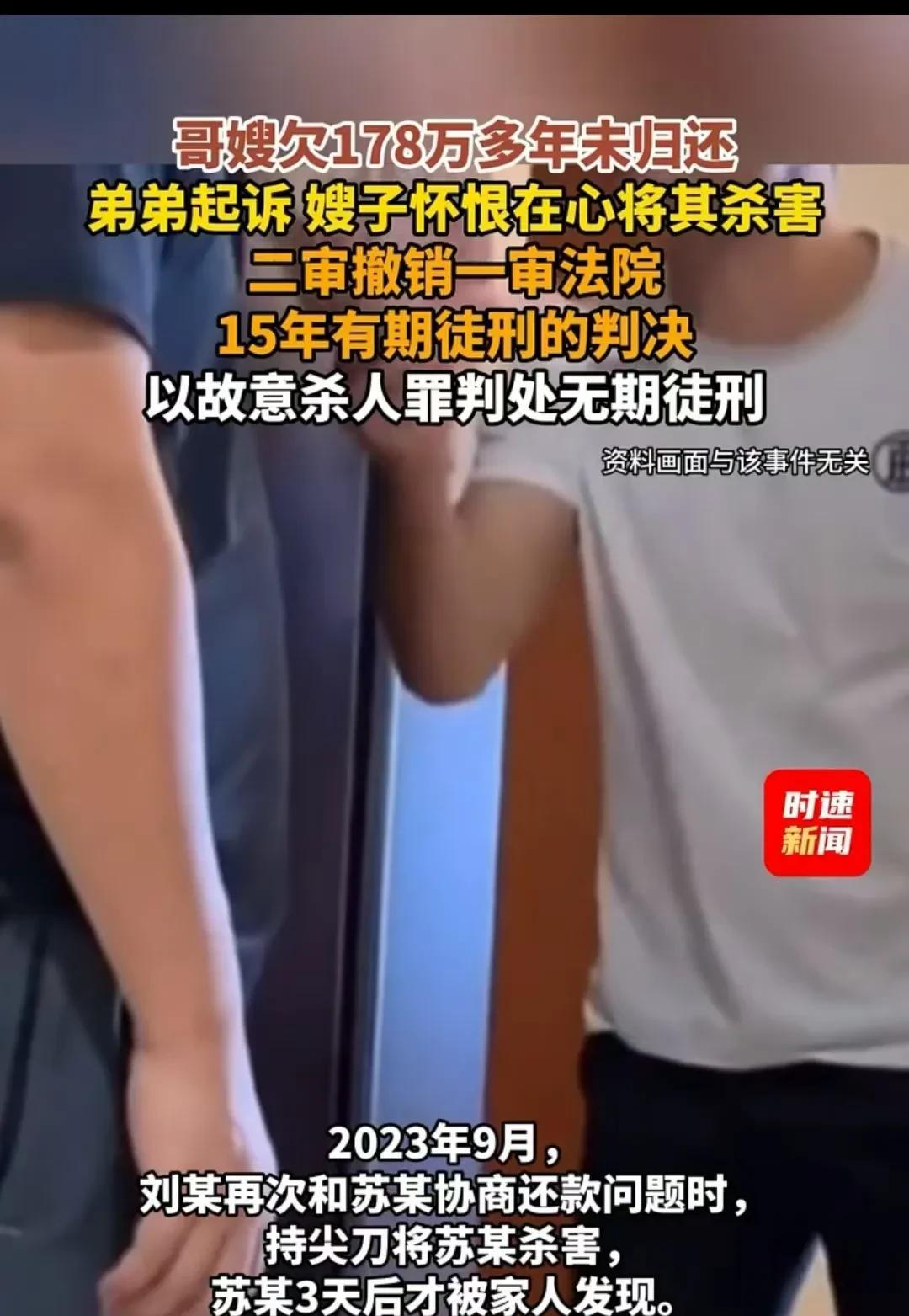 内蒙古,男子借给哥嫂178万,到期后未归还。男子将哥嫂起诉至法院,哥嫂的一套价值90万的房子被强制执行。对于尾款的还款方式,双方再次发生争执,嫂子怀恨在心,戴着帽子、口罩,拿着尖刀上门,将男子捅伤致死。事后,亲戚陪同嫂子一起投案自首。一审法院判处其有期徒刑15年,检察院提出抗诉,二审法院改判其无期徒刑,剥夺政治权利终身。 苏先生突然接到哥哥的电话,说自己的生意周转不过来,问他那里能不能挪一点钱出来周转。苏先生手头正好有闲钱,再加上那是自己的哥哥,自然没有拒绝。 他便把自己手头的178万借给了哥哥和刘女士,并且签下了借条。刘女士也非常感激苏先生在他们困难的时候鼎力相助,承诺一定会按期归还。 这笔钱是2008年借的,可到了还款日期,却发生了变故——哥哥和刘女士无力偿还。 而苏先生这边也需要资金周转,因此不顾兄弟情分,三番五次上门追债。 毕竟“亲兄弟明算账”,当初哥哥遇到困难时,苏先生二话不说就借了钱,如今自己需要用钱,对方却到期不还,这让苏先生实在难以接受。 最后,苏先生直接起诉了哥哥和刘女士,因为当时借条上签的是他们两人的名字。 法院判决二人在十日内归还借款,但期限届满后,他们仍未履行,案件随后进入强制执行程序。 哥哥和刘女士名下有一套价值90万的房子,于是在2023年,这套房子被依法拍卖抵债。 可即便如此,仍有几十万尾款未还清,哥哥和刘女士却开始耍赖,拒绝偿还剩余欠款。 刘女士对此十分生气,觉得唯一的房子被强制执行,都是苏先生造成的,便将怨气全撒在了他身上。 但苏先生没有罢休——既然已经和哥嫂闹僵,也就不再顾及亲情,坚持要求他们将剩余的几十万一并还清。 刘女士觉得苏先生是把自己逼上了绝路,认为“哪有弟弟这样逼哥嫂的”,心中的恼怒越来越深。 2023年9月,她戴上口罩和帽子,拿着事先准备好的尖刀上门,名义上是“讨要说法”,实则早有不满。 她觉得自己如今近乎无家可归,全是苏先生的错,认为苏先生根本没把他们当亲人,就是故意要逼死他们、看他们的笑话。 苏先生急忙解释:“我不是有意要逼你们,是我自己的生意也出了问题。 再说,当初你们承诺会还的钱,难道不该还吗?那也是我辛辛苦苦挣来的!” 双方在争执中情绪越来越激动,刘女士一气之下,拿起尖刀多次刺向苏先生,随后仓皇逃离现场。 三天后,有亲戚联系不上苏先生,上门敲门也无人应答,便报了警。 警方到场后,才发现苏先生已经遇害。而刘女士伤人后,一直心神不宁,回家后的反常表情被亲戚识破。 亲戚追问下得知真相,赶紧带着她到公安机关投案自首,这时她才知道,自己的小叔子已经去世。 由于双方是至亲,苏先生的家属最终对刘女士表示了谅解。 同时,被害人亲属的谅解是基于“亲属关系”,并非因为刘女士积极赔偿损失、真诚悔罪,不能作为大幅从轻处罚的依据。 二审法院审理后采纳了抗诉意见,认为一审判决虽认定事实清楚、定罪准确,但未充分考量刘女士的主观恶性(事前预谋、事后逃避),量刑畸轻,与她的罪行严重程度不匹配。 最终,二审法院改判刘女士无期徒刑,剥夺政治权利终身。 1、苏某借178万给哥嫂,俩人之间的债权债务是合法的。 按《民法典》第六百七十五条,借了钱就得按约定时间还,哥嫂到期不还,苏某去法院告他们,这是合法维权,法院判哥嫂10天内还钱也没毛病。 2、哥嫂没按法院判决还钱,苏某申请强制执行,这步也对。 《民事诉讼法》第二百四十二条说了,被执行人不履行义务,法院能查他财产,还能扣、冻、变卖掉换钱还债。所以法院把哥嫂90万的房子卖了抵部分债,流程完全合法。 刘某提前准备刀、还乔装,专捅要害,捅完也不救,直接锁门跑了,心思太坏,手段也狠。