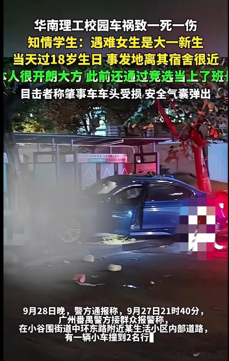 哎,这事儿太让人难受了!华南理工校园里出了车祸,一死一伤。听说遇难的女生是大一新生,当天刚过18岁生日,事发地离她宿舍还特别近… 知情学生说这女生人很开朗大方,还竞选当上了班长,多好的姑娘啊,就这么没了…目击者说肇事车车头都损了,安全气囊也弹出来了。 真的是天有不测风云,18岁生日成了忌日,太让人揪心了!希望大家不管在哪都注意安全,也愿逝者安息…