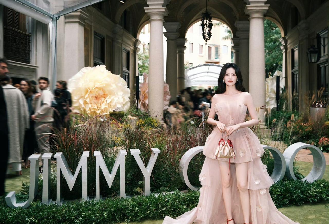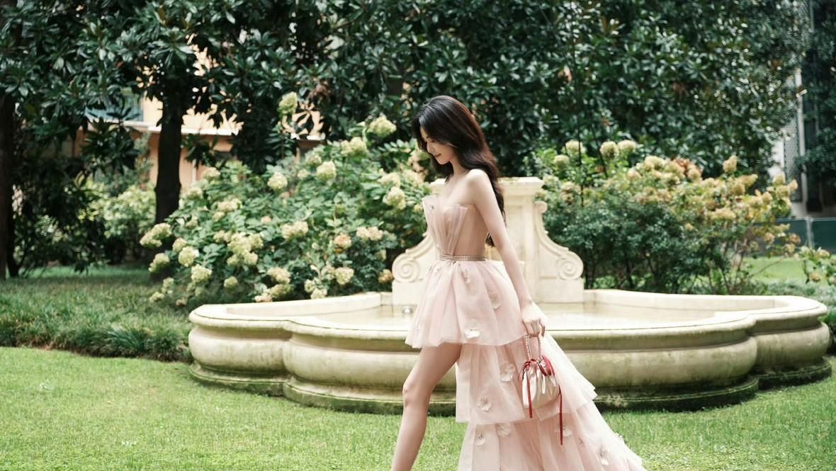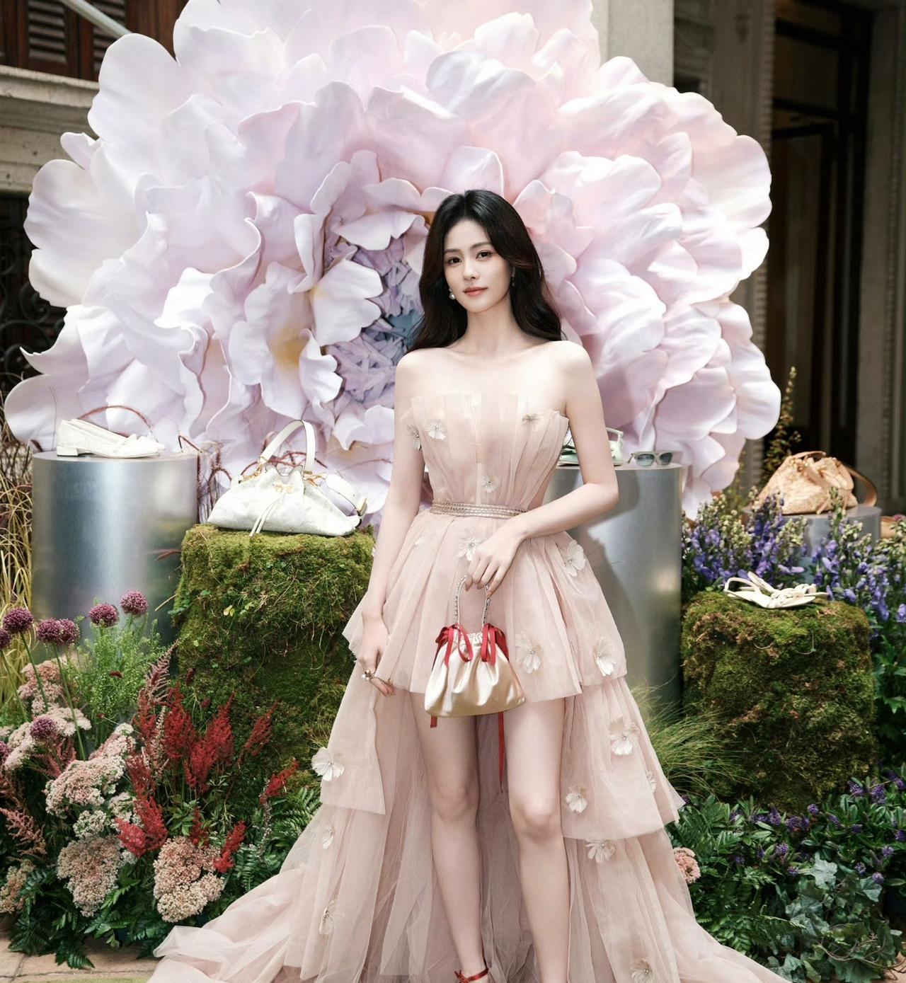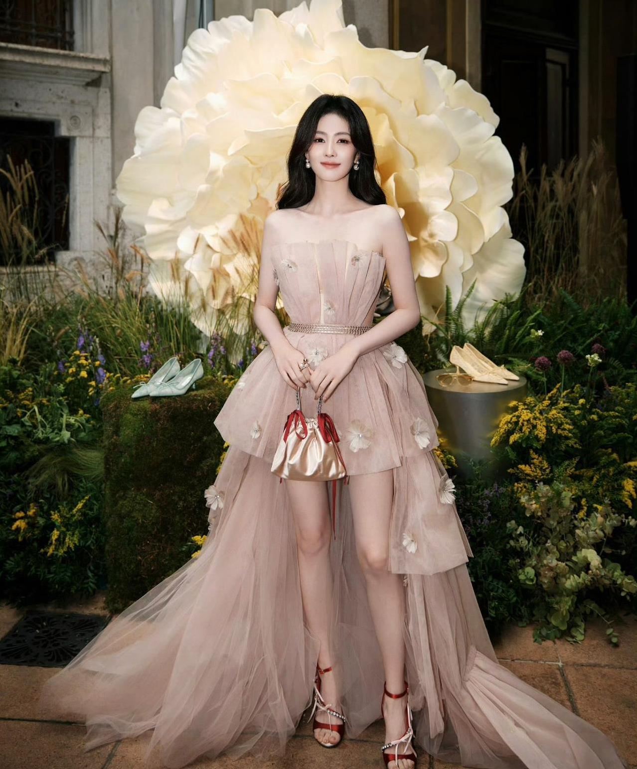 白鹿把品牌活动穿出了红毯即视感! 一身裸粉色高定纱裙,前短后长的拖尾设计配立体花饰,手拿钻链云朵包,脚踩红丝绒高跟鞋,在花园和艺术装置间穿梭,又甜又仙像从童话里走出来的公主!#白鹿# #白鹿造型#