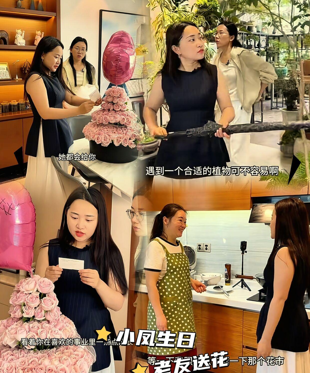 小凤夸赞周阿姨做的鸡爪好吃,虽然周阿姨没学过,但她的家常菜做的很好,而且卖相也不错,很少翻车,完全不输红姐和胖阿姨啊。小凤生日,老友还送了粉色玫瑰花,两个儿子凌晨去房间送了祝福,太懂事了子皓和念念,兄弟俩都非常乖巧。小凤和小娜去买了鲜花,云南待了一个多月,植物都枯死了,又买了上千的绿植,真有钱啊