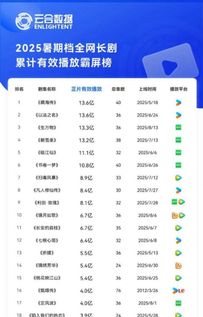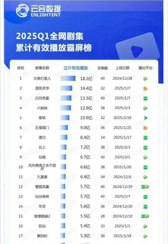 今年到目前为止全年大数据——最爆的剧应该是口碑 讨论度,收视率长尾 和数据并驾齐驱。 1.《大奉打更人》18.3 亿 2.《国色芳华》14.4亿 3.《藏海传》13.6亿《以法之名》13.6亿 4.《白月梵星》13.3亿《生万物》13.3亿 5.《朝雪录》13.2亿 以上为前五名