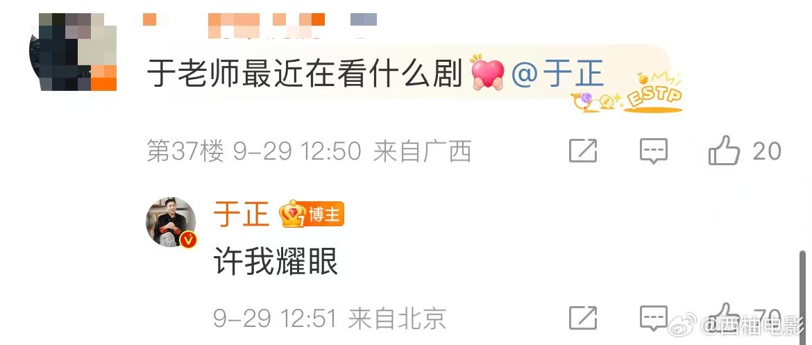 随后,有网友在评论区问于正最近在看什么剧,于正回复:“许我耀眼”。