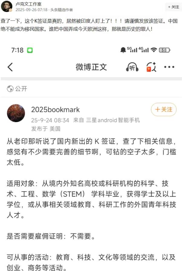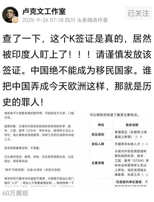 中国将于2025年10月1日起实施的K字签证,面向全球STEM领域青年科技人才,无需国内单位邀请或雇佣,可独立申请,入境后可从事教育、科研、文化交流、创业及商务活动。 而卢克文前两天还发文提醒中国决不能成为移民国家。讲实在的,科技强国是离不开人才的,引入国外的人才并不是坏事,但就怕这个发放的门槛偏低,也有人说,咱们拼了四十多年,好日子刚开头,没道理让外人来摘了桃子。大家怎么看,一起评论区唠唠! 就在10月,中国要发放一种新签证,叫K字签证,这事儿本来挺简单,却在全球科技圈里掀起了不小的波澜。 以前外国科技人才想来中国发展,手续特别麻烦,得先找个单位挂靠,等着企业发offer,来回折腾大半年。 现在好了,K字签证把这些繁琐的步骤都砍掉了,只要是STEM领域(科学、技术、工程、数学)的人才,拿着自己的学历和成果就能直接申请。 这个政策最绝的地方在于给了人才充分的自由度,拿到签证后,可以去高校教书,也能进实验室搞研究,想创业的话直接进科创园区,还能对接投资机构。 这种“全能型”签证在全球都不多见。 政策一出,印度的IT圈最先沸腾了,原因很简单,美国刚把H-1B签证费用从几千美元涨到了10万美元。 要知道印度IT人才一直把H-1B当成职业跳板,每年获批的七成以上都是印度人,现在美国这一加价,等于把他们的“美国梦”掐断了。 中国抓住这个时机推出K字签证,简直是踩在了点子上,中国现在有全球最完整的科技产业链,从芯片设计到智能制造,从AI算法到生物医药,每个环节都有成熟的产业基础。 而光是国家级AI创新试验区就有20多个,创业资金动辄上千亿。 比起美国,中国的优势更实在,在美国开科技公司,光场地租金和人力成本就比中国高一半。 而在中国,进科创园区能免两年房租,找代工厂半小时车程就能到,融资对接会一周一次,这种实打实的产业环境,才是真正吸引人才的地方。 这股“赴华热”很快就从印度蔓延开来,欧洲的新能源研究员盯上了中国最大的光伏实验室,东南亚的AI创业者对中国短视频技术生态跃跃欲试,连原本准备去美国的拉美工程师也开始打听K字签证的申请流程。 不过,这个政策也引发了不少争议,有人担心审核标准是否严格,会不会让一些滥竽充数的人混进来。 还有人觉得这可能影响国内就业市场,毕竟本土年轻人找工作也不容易。 但仔细想想,这个政策的出发点很清楚:中国现在确实在高端科技领域缺人,虽然国内STEM专业毕业生不少,但在人工智能、量子计算这些前沿领域,能做突破性创新的人才还是不够。 K字签证最大的创新在于改变了引才思路,不再是“缺什么找什么”,而是先搭好发展平台,让人才自己选择。 而中国现在有产业基础、有资本支持、有广阔市场,就差能带来创新突破的“金头脑”。 当然,政策能不能见效,还得看执行,比如审批速度要快,研发设备要便利使用,知识产权保护要到位。这些“软环境”做好了,才能真正留住人才。 从全球视角看,这张小小的签证可能会重新洗牌STEM人才的流向图,美国靠H-1B签证吸引了几十年的全球人才,现在却主动收紧政策,中国适时推出K字签证,不是简单地捡便宜,而是在为下一轮科技竞争储备力量。 毕竟在这个创新驱动的时代,谁能汇聚全球顶尖人才,谁就能在科技赛道上占据先机,K字签证的意义,或许就在于打开了一扇面向未来的窗。 对此,大家有什么想说的呢?欢迎在评论区踊跃留言!麻烦看官老爷们阅读后点赞关注,谢谢! (个人观点,理性观看)