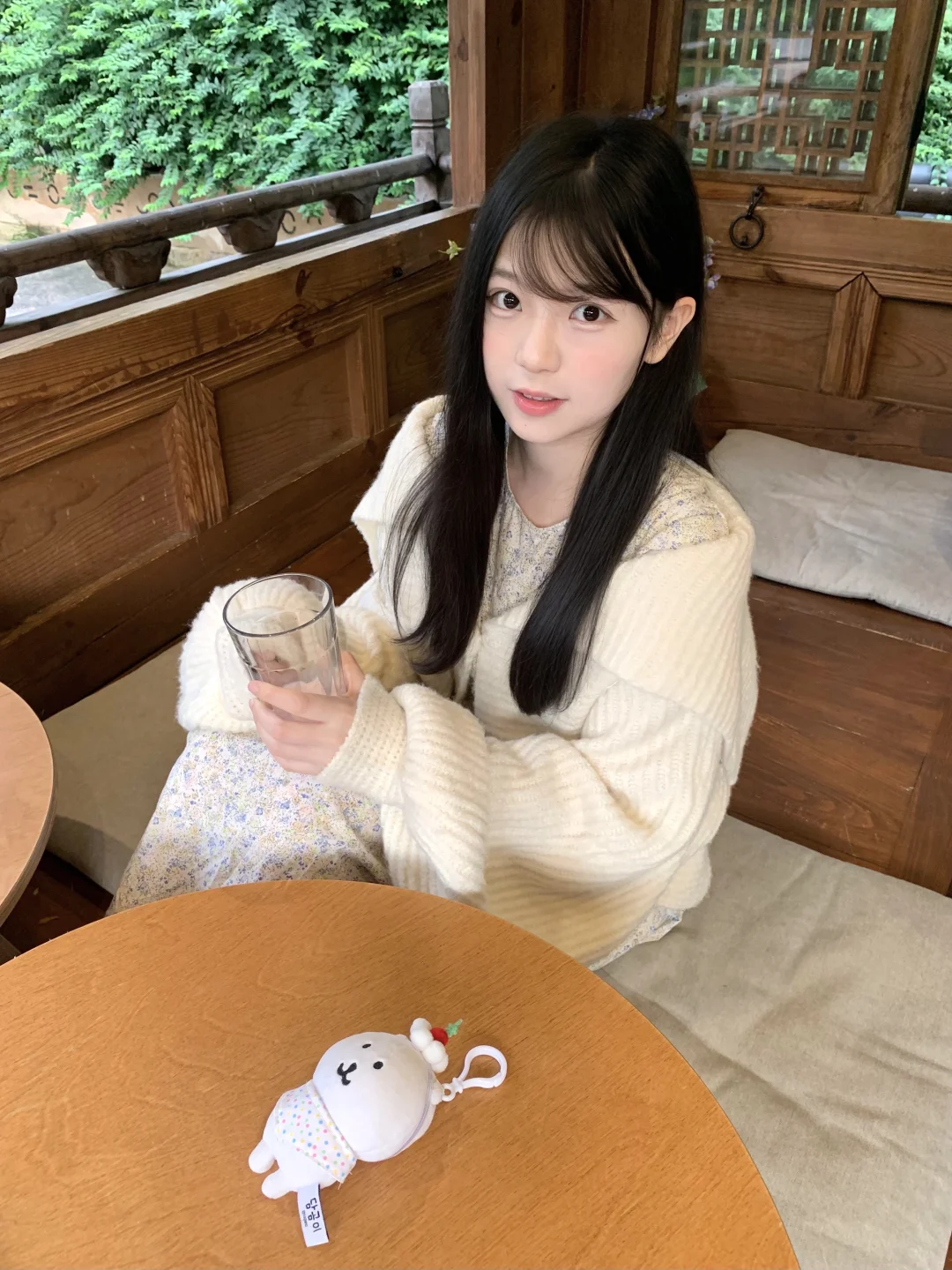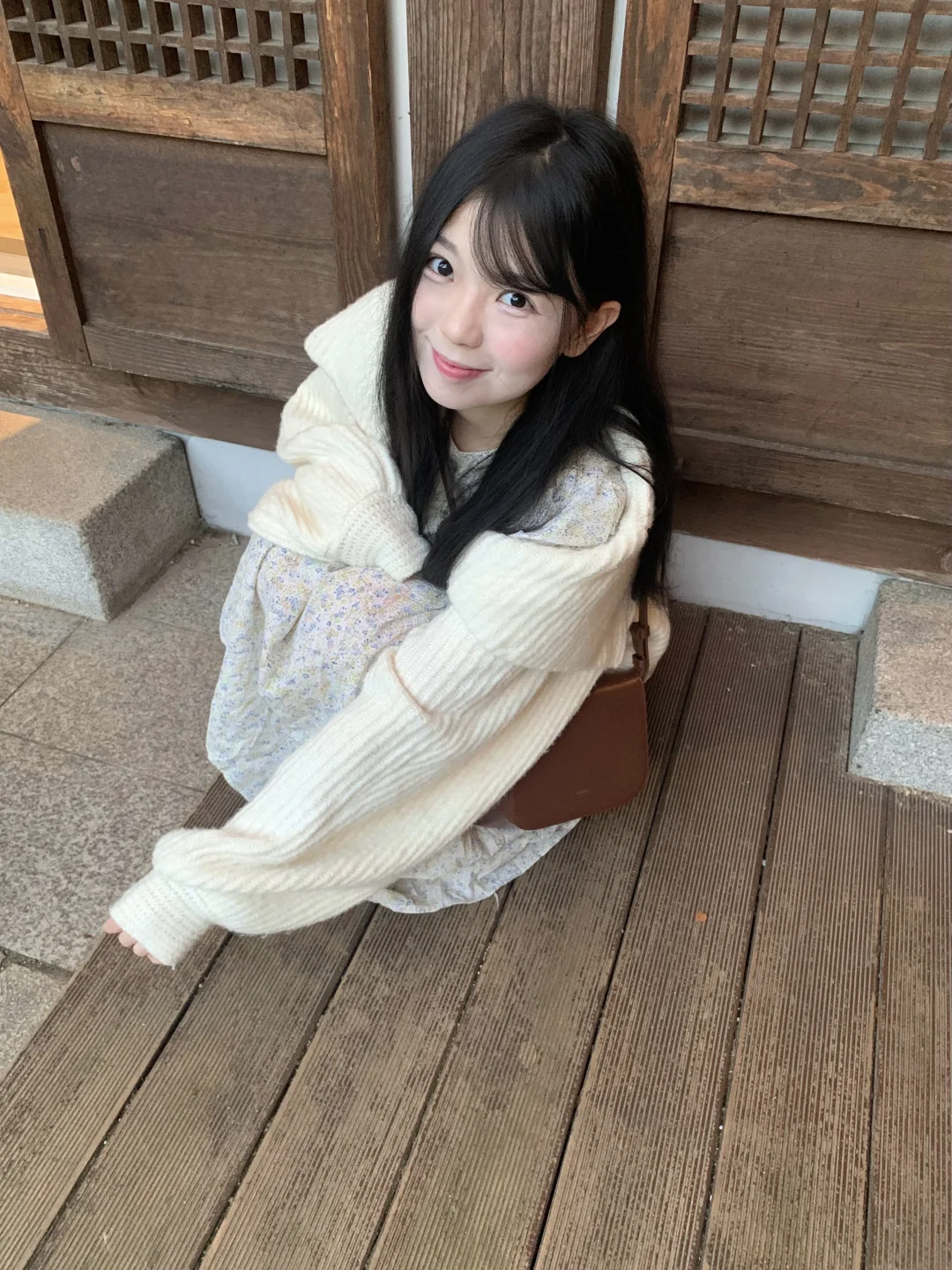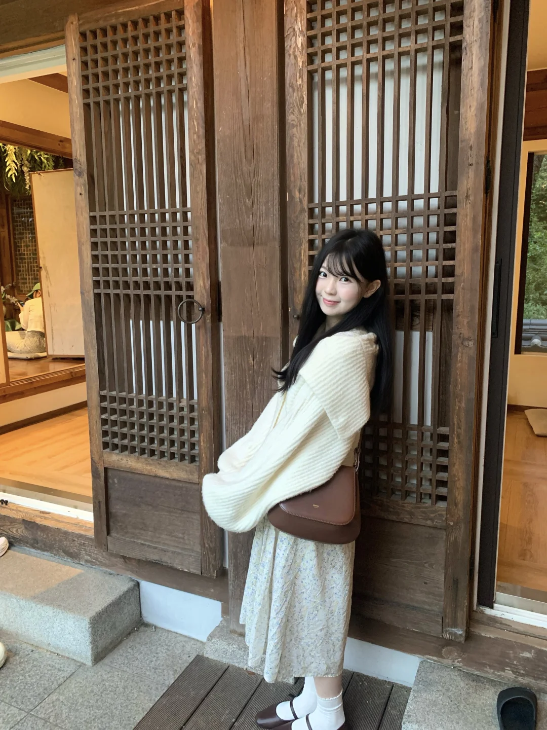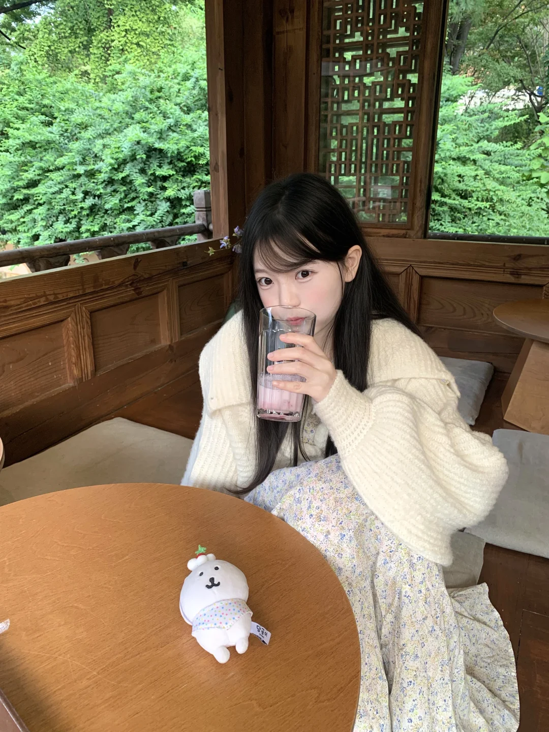 初秋的早晨在韩屋附近散散步好舒服~🍂 白色毛衣搭配碎花裙好温柔[喝奶茶R]