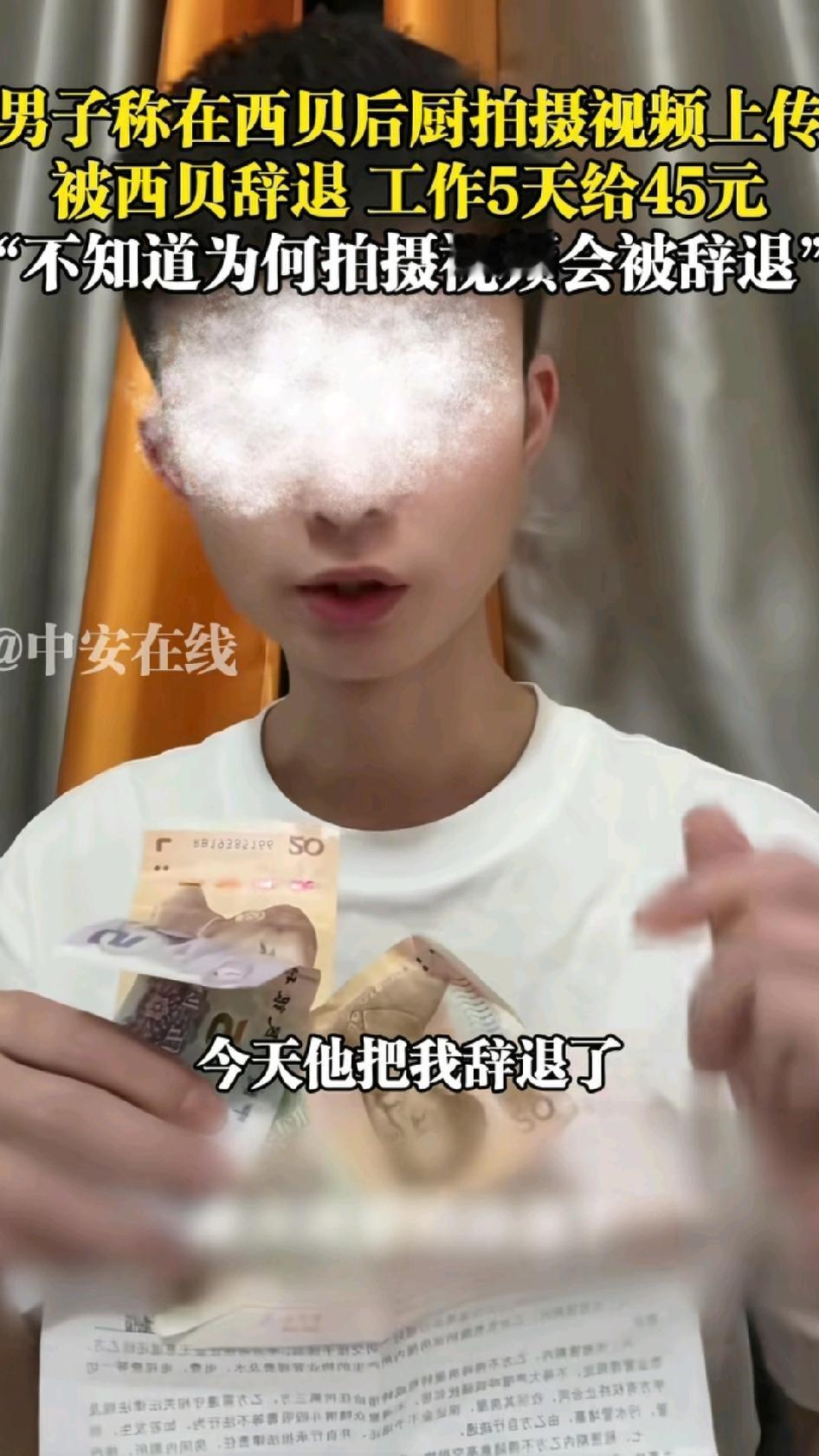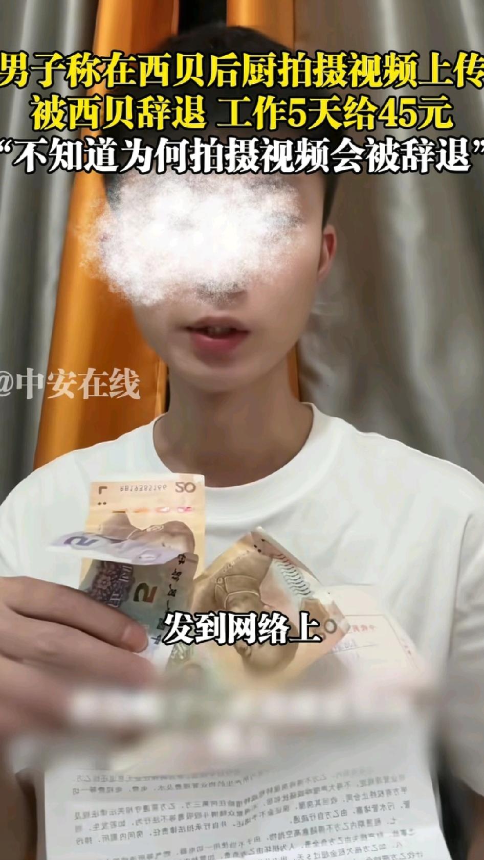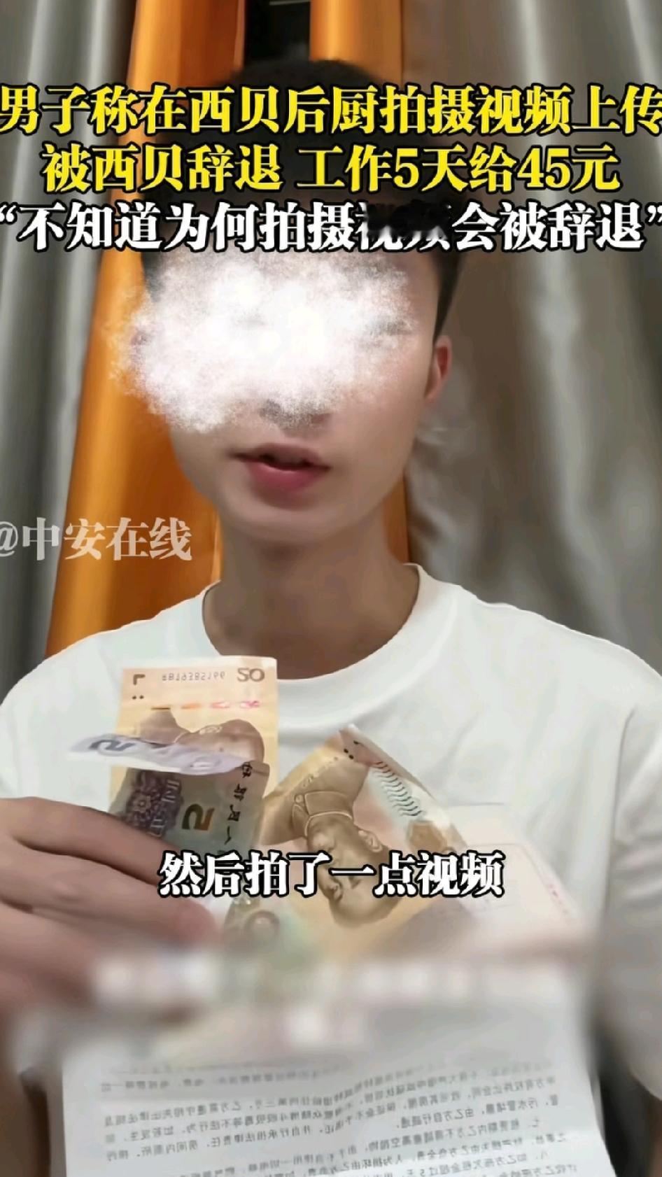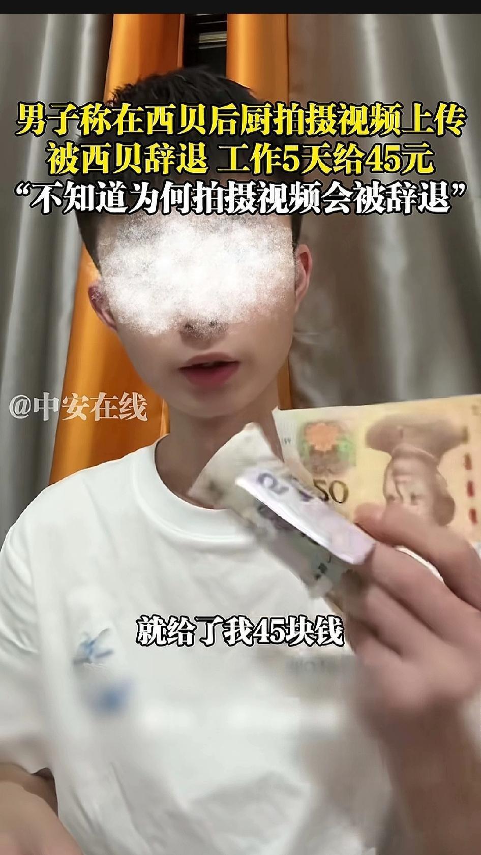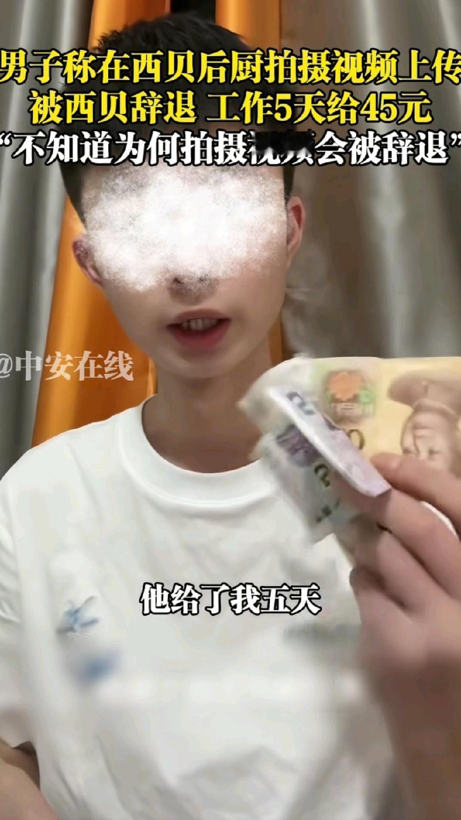 干了5天,只给45块钱,西贝又摊上事了!就在今天,一男子在网络上发布视频,他说,他在西贝后厨工作,因为拍了一些视频上传网络,西贝知道后就把他辞退了,给了他5天的钱,总共45块。这个男子不明白,为什么就拍了后厨的一些视频,就把他给开除了!这其中肯定有原因。 西贝现在处于风口浪尖,这个被开除的员工在后厨随意拍视频,万一这些视频有不合时宜的地方,西贝又要被卷入更大的风口浪尖,所以,西贝应该给员工强调过不能拍后厨视频,这个男子很可能就是因为违规了,才被开除的。如果是这样,也算合情合理。 但是,在西贝后厨干了5天,每天给9块钱,一顿饭钱都不够,也太欺负人了。虽然说西贝后厨不过是装装盘,用电磁炉热一下菜,但按照现在的工价,不管干什么,最起码也得100块一天。西贝应该把钱给男子补上,那么大的公司,应该不缺这500块钱。 最后,期待着西贝的回应!!
