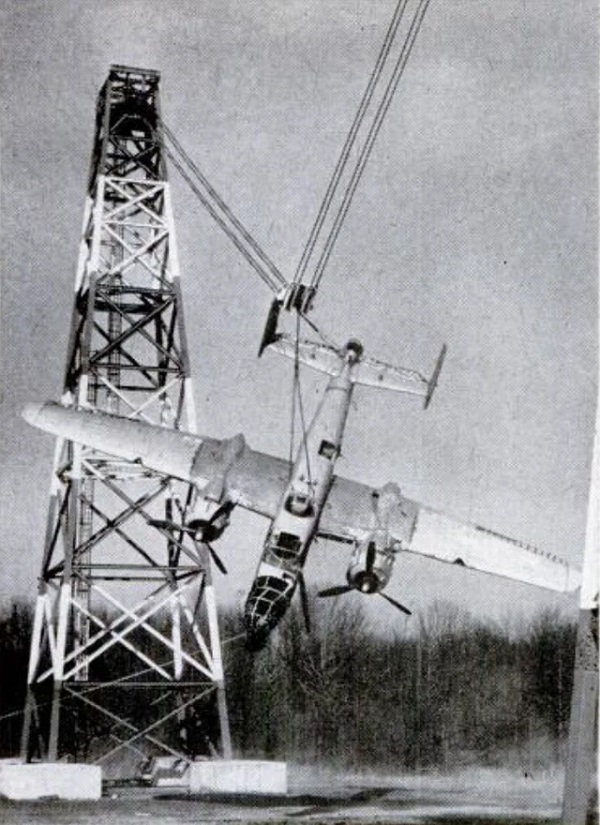 你要知道美国是个特别人性光辉的国家。话说有次有个麻雀被路边裸露的几根50KV高压线缠住了,它发出的惨叫被路人听到,他们马上打110求救。层层上报后一直捅到白宫,然后美国总统下令一架专机去撞断全国总电线,救下麻雀。做这个决定只花了半个小时!人性光芒闪闪亮啊。 但是你也要知道,飞机不是个结实东西,它其实什么都不敢撞,它要真敢撞怎么会有防空气球这种东西存在?然后就这样了,飞机完了,麻雀也被电线勒死了,全美大停电,啥都没成。本来只需要拉下闸刀的事,他们非要派飞机,也不知脑子里在想什么。 好了,这其实是二战后,用B-25在阿伯丁试验场进行的爆炸试验,飞机是用滑轮组悬挂在两个铁塔之间的。在四十年代末到五十年代初这段时间,数百架飞机被用于武器和爆炸试验,以便为新型飞机的设计提供真实数据。第一张照片注明70磅TNT炸药被引爆以模拟远处爆炸的核子导弹冲击;第二张照片可见机头领航舱已扭曲歪斜,但标注是经过分析,试验人员认为如果飞机在真实飞行状态下受到这样的攻击,它是可以幸存下来的。