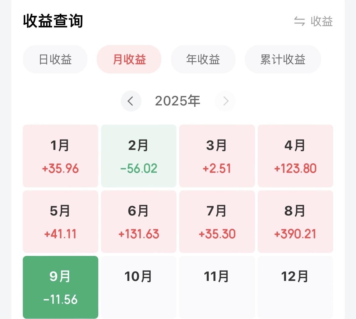 自从买基金以来,每天晚上睡前都要做的一件事就是查看一下当天的收益情况! 9 月份还剩明天最后一个交易日了,投资金额 2.6 万,今日收益有 155 元,而 9 月份的整体收益还是-11 元。 明天也是最关键的一天,决定了 9 月份的总收益能不能变成正数! 我重仓的是红利基金,所以 9 月份的收益肯定不会很好的! 大家 9 月份都赚到钱了吗?