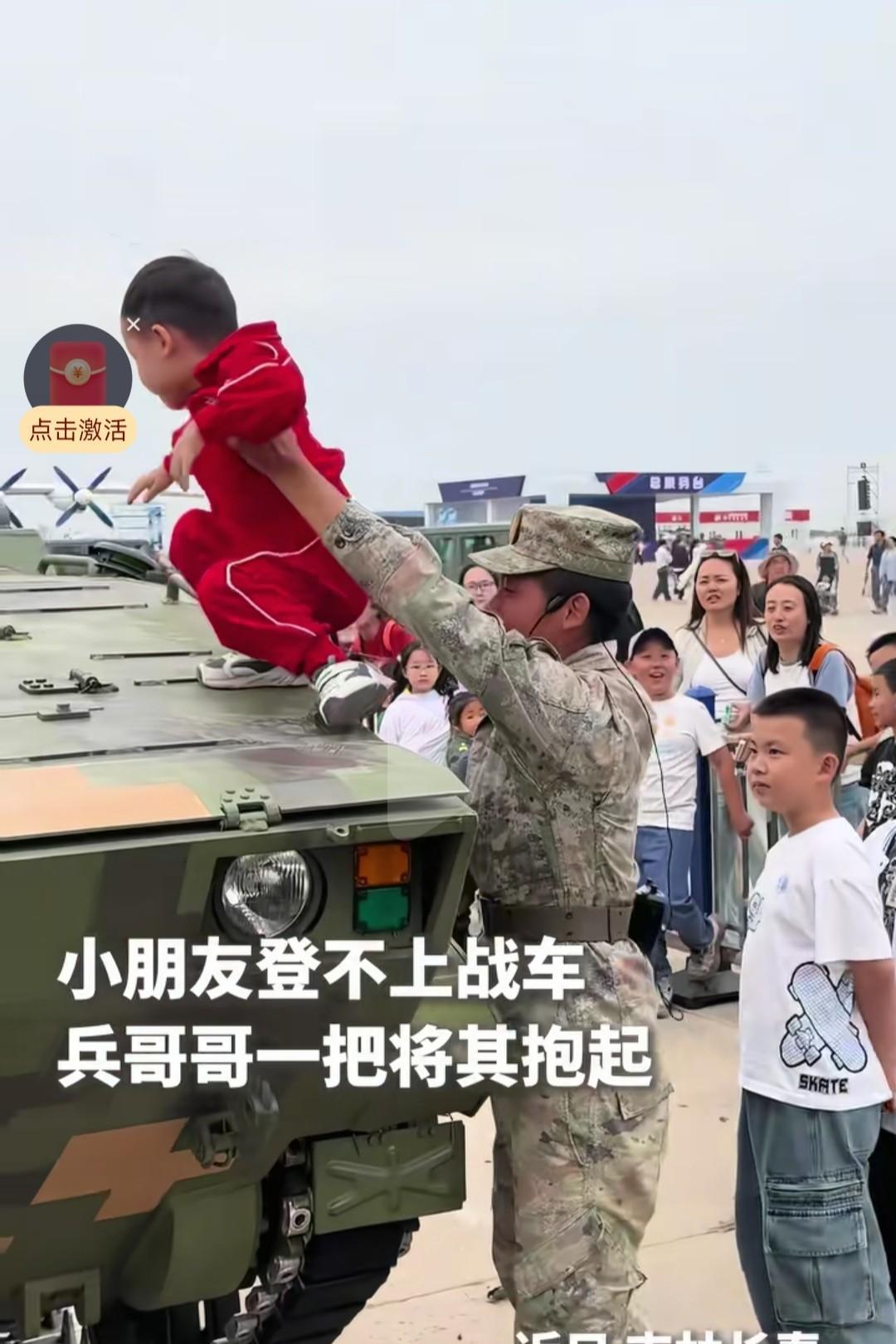全国小朋友都羡慕了!长春航空展上,小朋友登不上战车,兵哥哥一把将其抱起,他手扶瞄