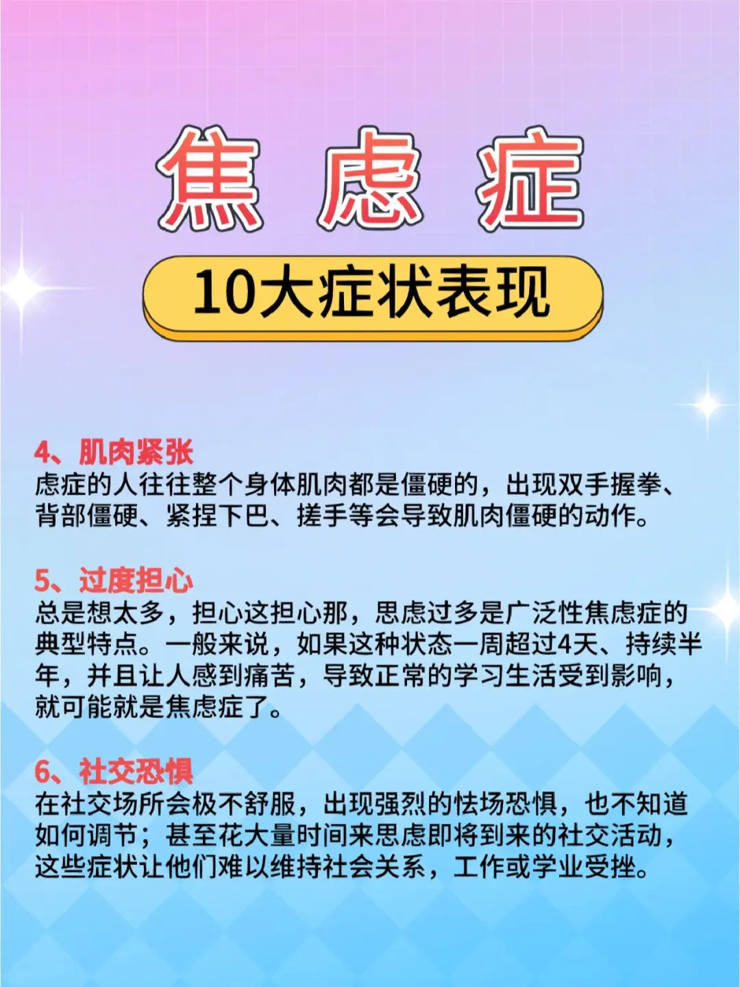 5、过度担心总是想太多,担心这担心那,思虑过多是广泛性焦虑症的典型特点。一般来说,如果这种状态一周超过4天、持续半年,并且让人感到痛苦,导致正常的学习生活受到影响,就可能就是焦虑症了。