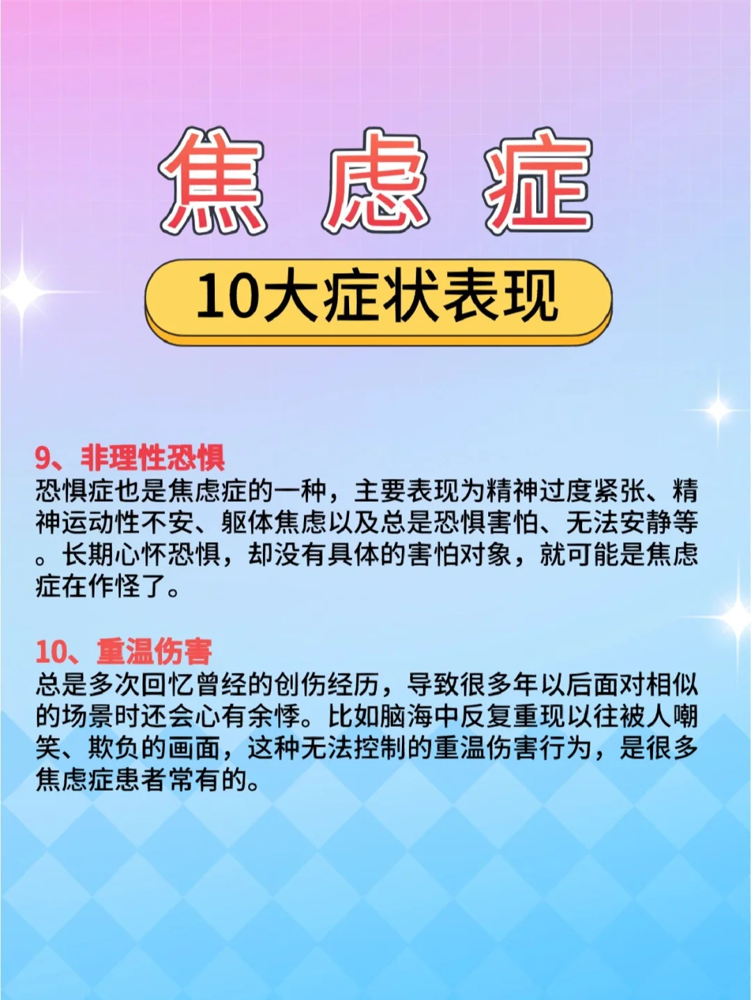 9、非理性恐惧恐惧症也是焦虑症的一种,主要表现为精神过度紧张、精神运动性不安、躯体焦虑以及总是恐惧害怕、无法安静等。长期心怀恐惧,却没有具体的害怕对象,就可能是焦虑症在作怪了。
