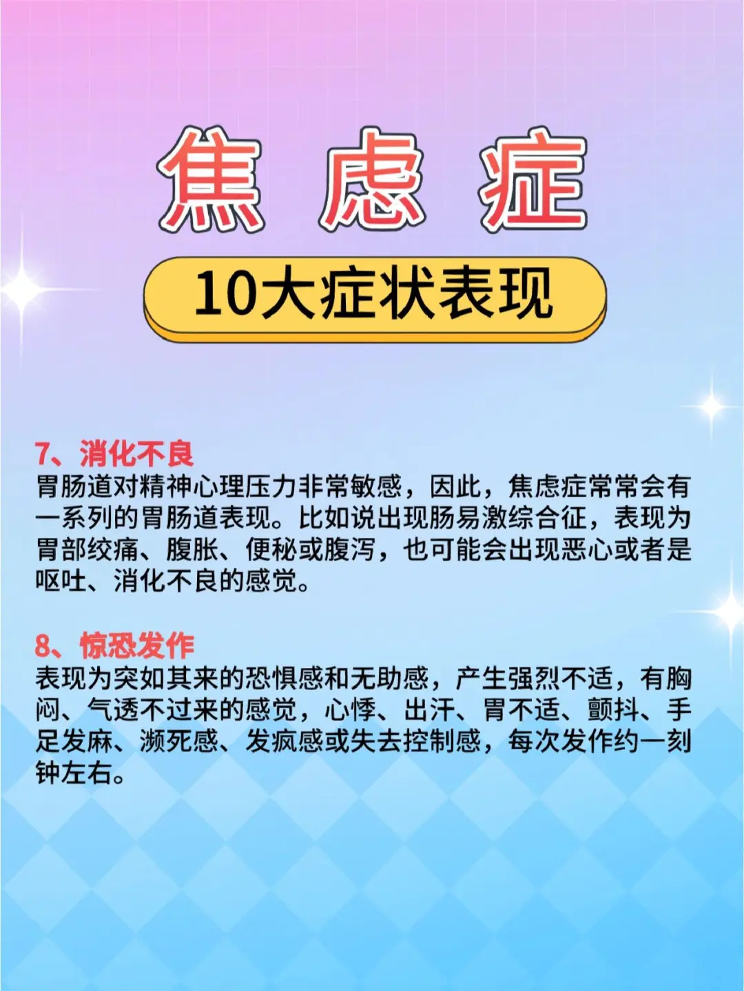 7、消化不良胃肠道对精神心理压力非常敏感,因此,焦虑症常常会有一系列的胃肠道表现。比如说出现肠易激综合征,表现为胃部绞痛、腹胀、便秘或腹泻,也可能会出现恶心或者是呕吐、消化不良的感觉。