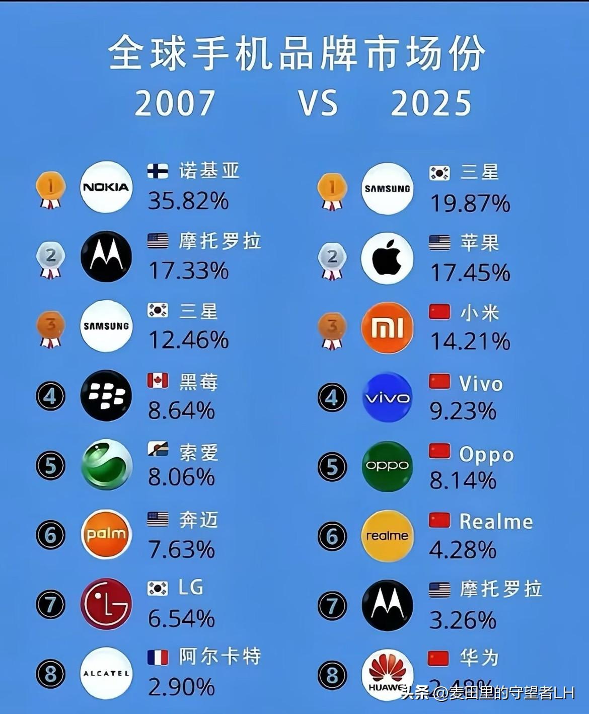 2025年全球手机品牌,市场占有率排行榜! 十八年前,可全部都是,外国品牌的天下
