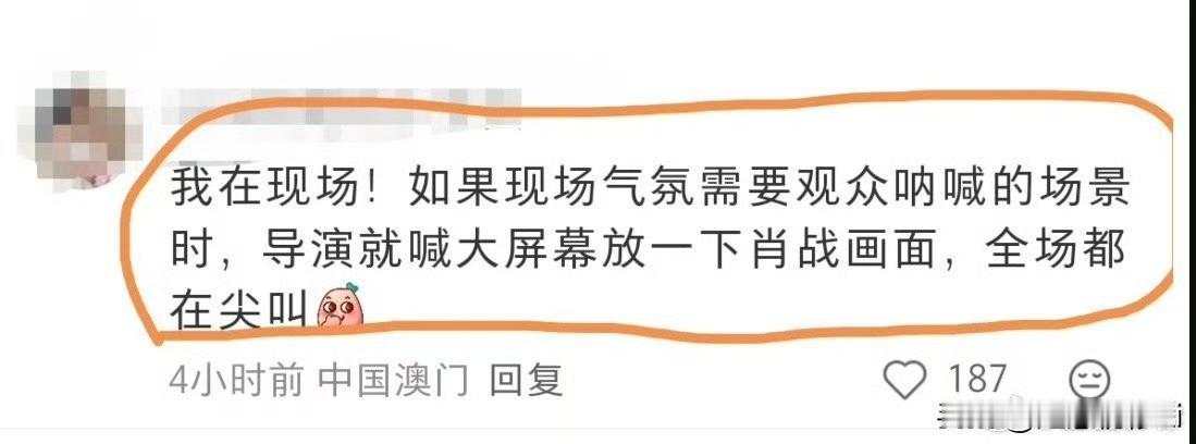 大湾区晚会现场工作人员说,肖战出场几乎95%的人都在拍肖战,场内根本无法淡定,肖战粉丝也太多太多,而且极具感染力,肖战的舞台表现又精彩,观众很难控制住不尖叫吧,如果我在现场也会尖叫的。 晚会导播也很懂,只要舞台表演需要欢呼声,就把镜头切到台下的肖战,立刻全场尖叫欢呼,看直播就更明显了,导播是很懂流量密码的。 还有一个更直观的数据,直播间肖战出场1000万观众观看看,肖战退场立刻就剩100万人了,说晚会现场80%的观众为肖战而来一点不稀奇,看晚会谁不想看巨星呢