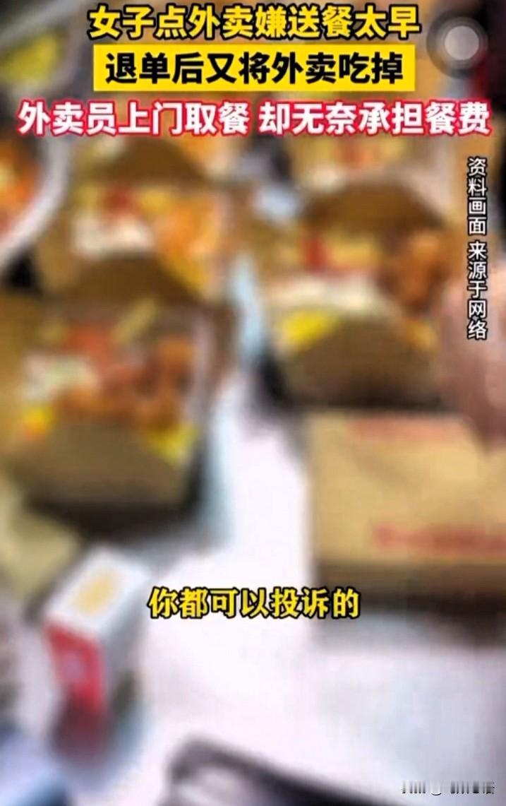 女子点外卖嫌送的太早,把点的外卖餐吃了还点退单,外卖员上门取餐,无奈自掏腰包付费