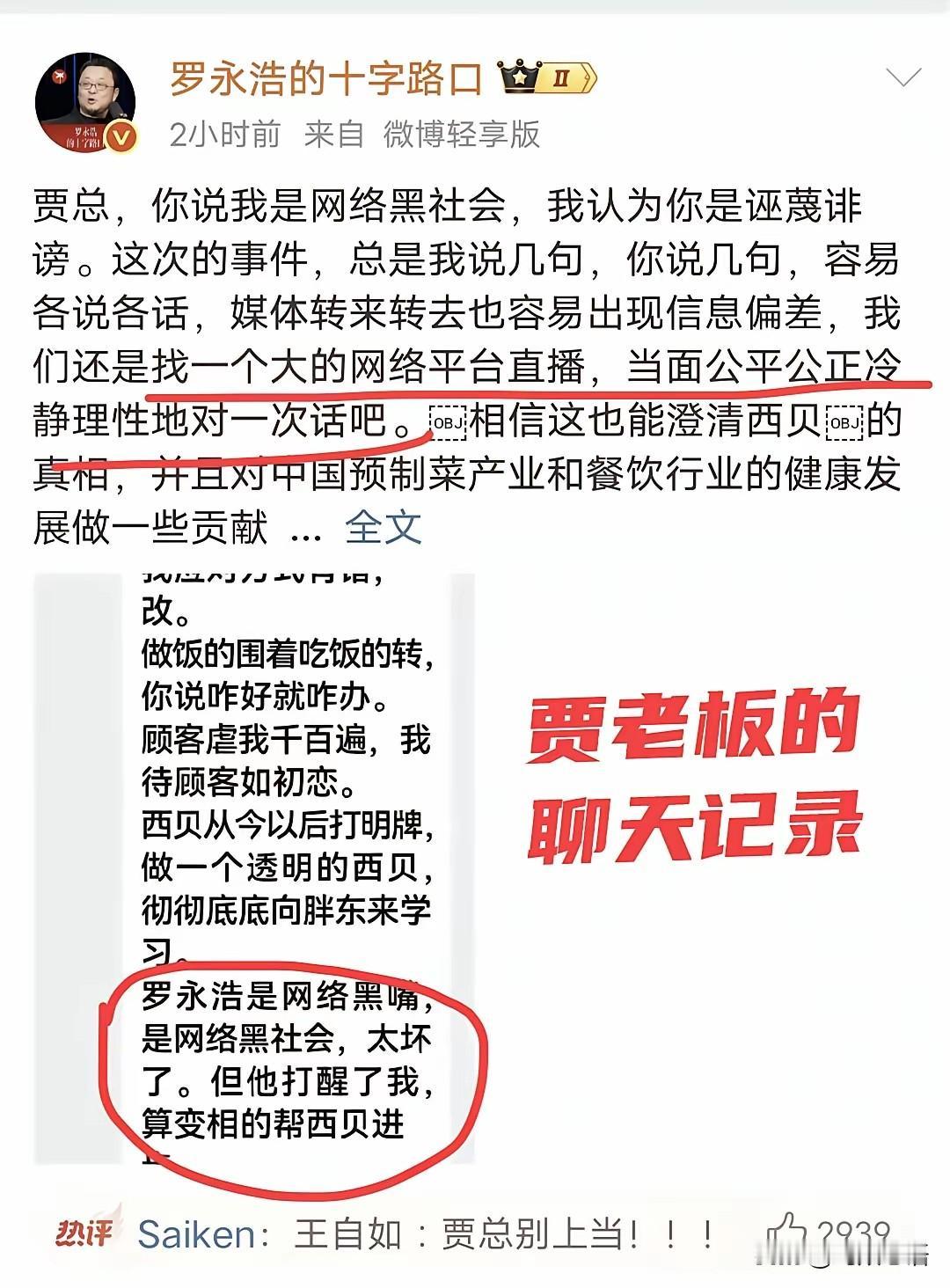 “顾客虐我千百遍,我对顾客如初恋”,这是西贝的发声! 最近西贝火了!我们来看看网友们是怎么说的: 这是说白了就是罗永浩Q作为消费者觉得产品不满意随口吐槽了一句,然后西贝就炸了,觉得他是公众人物, 不能随便说这说那的,是污蔑。 反过来想想,如果罗永浩觉得好吃然后顺手发微博夸了一下,西贝会给罗永浩代言费吗? 还有网友说:“人均消费接近100的中档餐馆,顾客要求你使用新鲜食材,不过分吧?” 有人说,西贝倒了1.8万人没工作了,感情为了1.8万人,所有人都要去西贝吃2岁的西兰花?N年冻鱼冻肉。市场消失只有老百姓没钱,其他时候不选东家会选西家,企业也一样,西贝倒了,就有其他企业发展起来了…消费在,市场在,就业就不会少! 群众的眼睛是雪亮的,顾客的真实感受,说的是心里话,错了就要改正,挨打就要立正!西贝餐饮 西贝公开信
