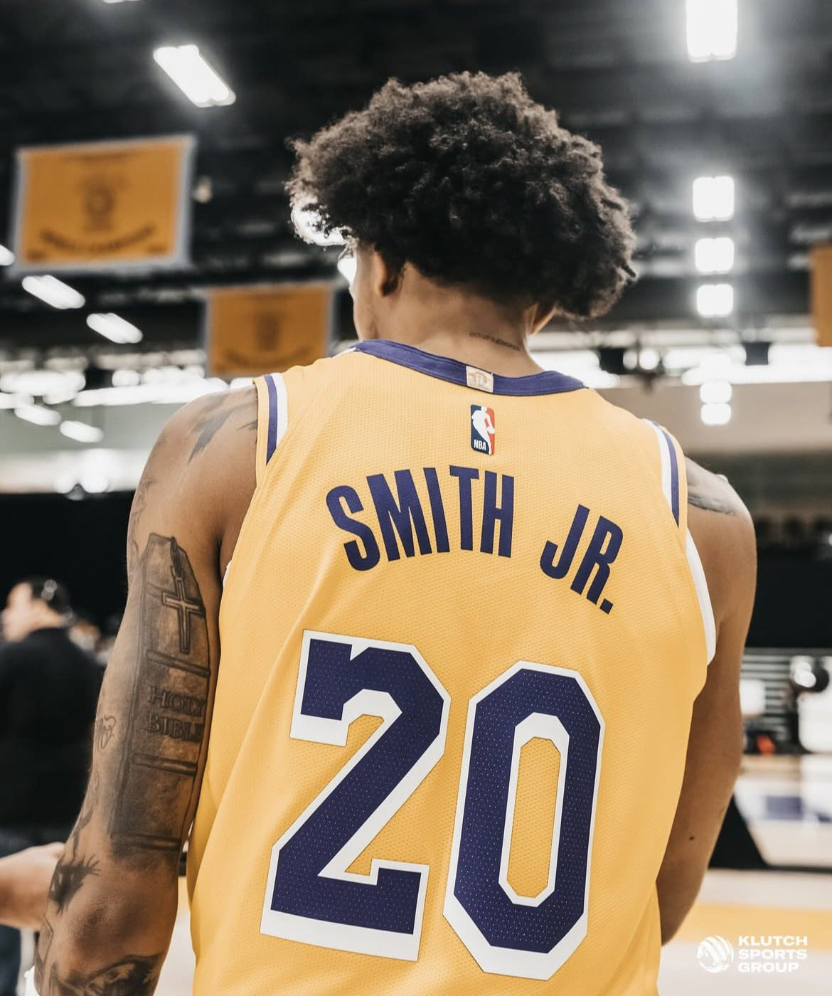 新湖人报道[锦鲤附体]小尼克·史密斯身穿20号球衣拍摄定妆照。最近3年穿过湖人2