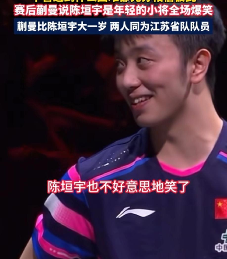 笑不活了,蒯蔓自己都没忍住,笑场了 蒯蔓陈垣宇3:2战胜申裕斌和林钟勋 接受采访的时候 蒯蔓谈到自己的新搭档陈垣宇 脱口而出 “ 陈垣宇是年轻的小将 ” 说完后,蒯蔓自己都没忍住,笑了起来,旁边陈垣宇,也是不好意思地看着身旁这个,只比自己大几个月的师姐 陈垣宇和蒯蔓同为江苏走出来的选手,两人2019年青运会的时候,配过混双 而后今年的全运会的时候,两人再次搭档混双 两人彼此之间很熟悉,但是其实对于混双的搭配来说,并不是很适应 但是蒯蔓的国际比赛经验,确实比陈垣宇丰富很多 两人在比赛的过程中,沟通和配合都很顺畅,陈垣宇面对蒯蔓这个“小前辈”,也很虚心 两人对彼此之间的帮助都很大 尤其是陈垣宇 昨天两人混双首场,先是对战法国名将西蒙高茨和帕瓦德的时候,取得了胜利 随后陈垣宇,又在单打中,战胜世排第四的奥恰洛夫