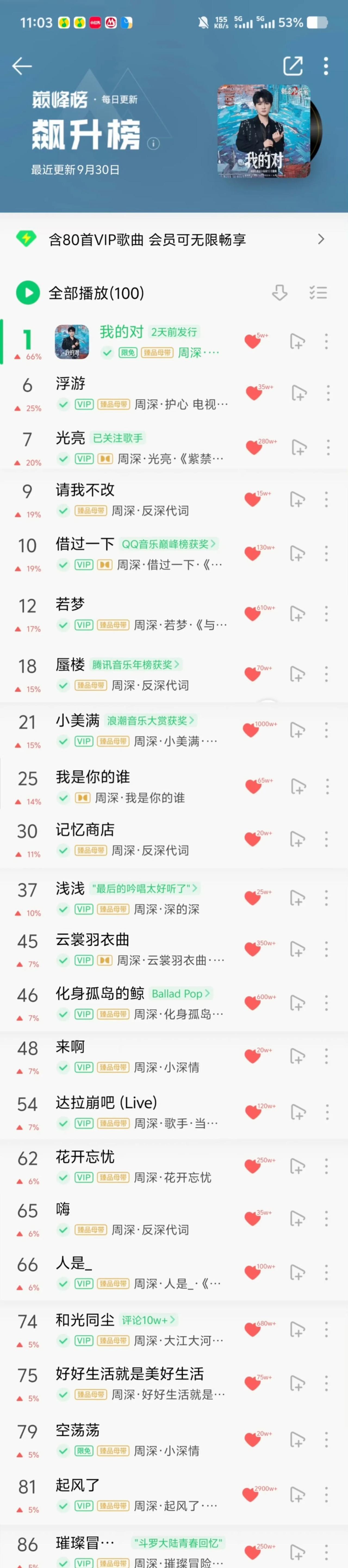 周深生日直播涨了八万多粉丝! 周深昨天一年一度的生日直播,涨了81668粉丝! 一场直播涨了两个体育场的人,这些人里面有可能会加入抢票大军的![呲牙] 别人直播带货,周深直播带歌! 看了一下qq音乐的飙升榜和听歌识曲榜,好家伙!都是周深直播间唱过的歌! #周深#