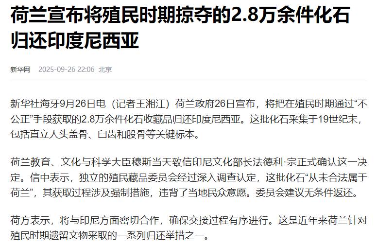 荷兰政府9月26日郑重宣布,将把在殖民时期通过掠夺获取的2.8万余件化石收藏品,尽数归还印度尼西亚。 根据荷兰文化遗产部的官方说法,这批化石里有古生物标本、地质样本等好多种类,大多是19世纪到20世纪初在荷属东印度时期采集的,对印尼来说是特别重要的自然遗产。 印尼外交部之后也发了声明感谢,说这是“实现历史正义的重要一步”,还能让两国文化交流更顺畅。 回头看看历史,荷兰在印尼搞了350多年的殖民统治,那时候不少文物和自然标本都被有计划地抢走了,这些东西的流失就成了两国历史上的一个心结。 这次要还的化石里,有不少古生物化石特别有科研价值,它们记录着印尼独特的地质变化过程,对研究东南亚古代生态环境来说,是别的东西没法替代的。 荷兰政府在声明里强调,这次还东西是本着“尊重文化主权和历史真相”的原则来的,这和联合国教科文组织《保护非物质文化遗产公约》里说的殖民遗产返还精神是一致的,也给全球解决类似问题提供了一个能实际操作的例子。 在现在的国际社会里,殖民时期抢来的东西该怎么还,一直是个没解决好的大事。 其实这些年,不少有过殖民历史的国家也开始慢慢正视这个问题了,但真要像荷兰这样大规模还东西的,还真没几个。 荷兰这次主动还2.8万件化石,不光是数量多,更重要的是它展现出了主动承担历史责任的态度。这种态度和以前那种被逼着才回应不一样,而是从制度层面建了一套返还殖民遗产的办法,给其他有殖民历史的国家做了个好榜样。 要知道,这些文化遗产回来,不只是把东西还回去那么简单,更是对被殖民国家文化主权的尊重,也是让历史恩怨化解的重要办法。 希望荷兰这个举动,能带动更多国家跟着做,一起加入到归还殖民遗产的队伍里来。只有正视历史,才能好好走向未来,也只有让那些流落在国外的文化遗产回到自己的家乡,才能真正抚平殖民历史留下的伤口。 荷兰用实际行动证明,承认自己过去的错、承担该负的责任其实并不难,反而能得到国际社会的尊重和称赞。 希望在荷兰的带动下,全球返还殖民遗产的进程会有新的进展,让更多漂泊在外的文化遗产能回到故土,重新焕发出它们该有的光彩。