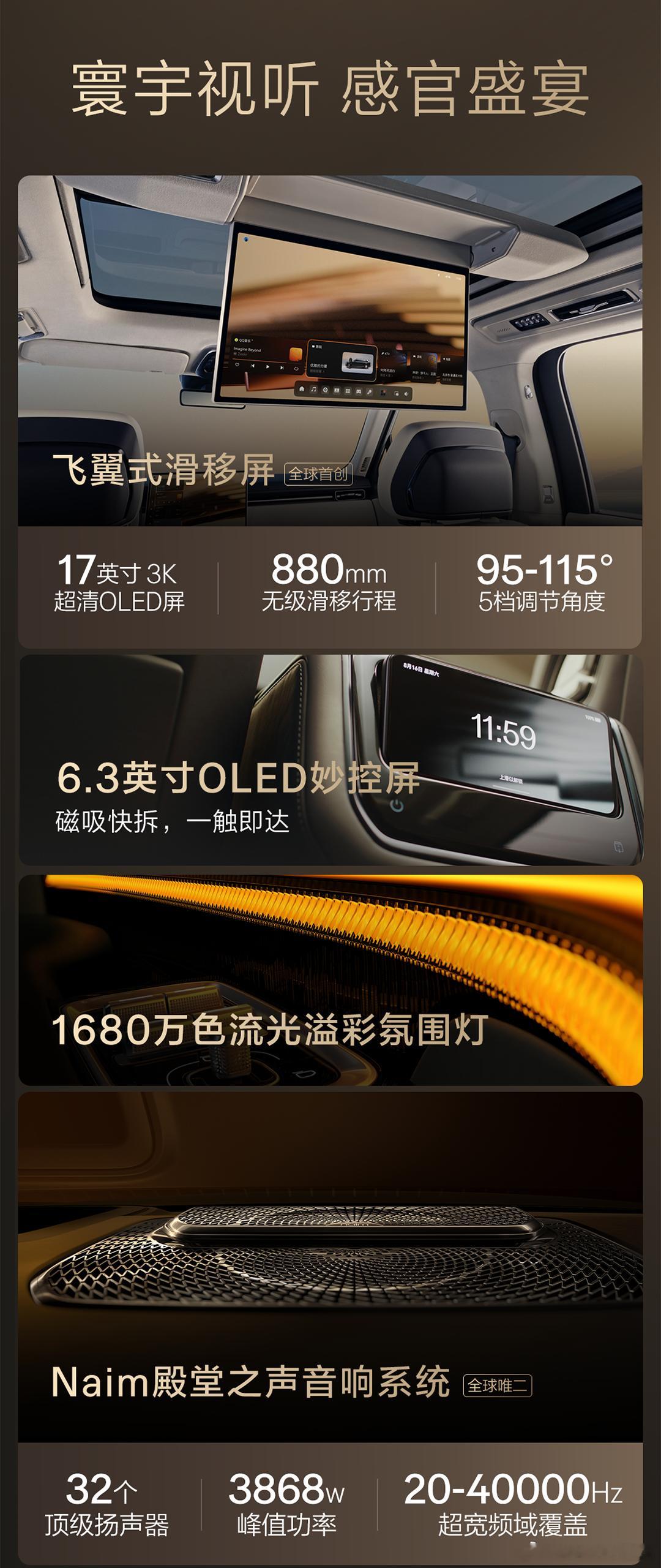 中间天空屏幕是可以移动的,好评;中间座椅可转过来,好评;大电池,三电机,动力好评。