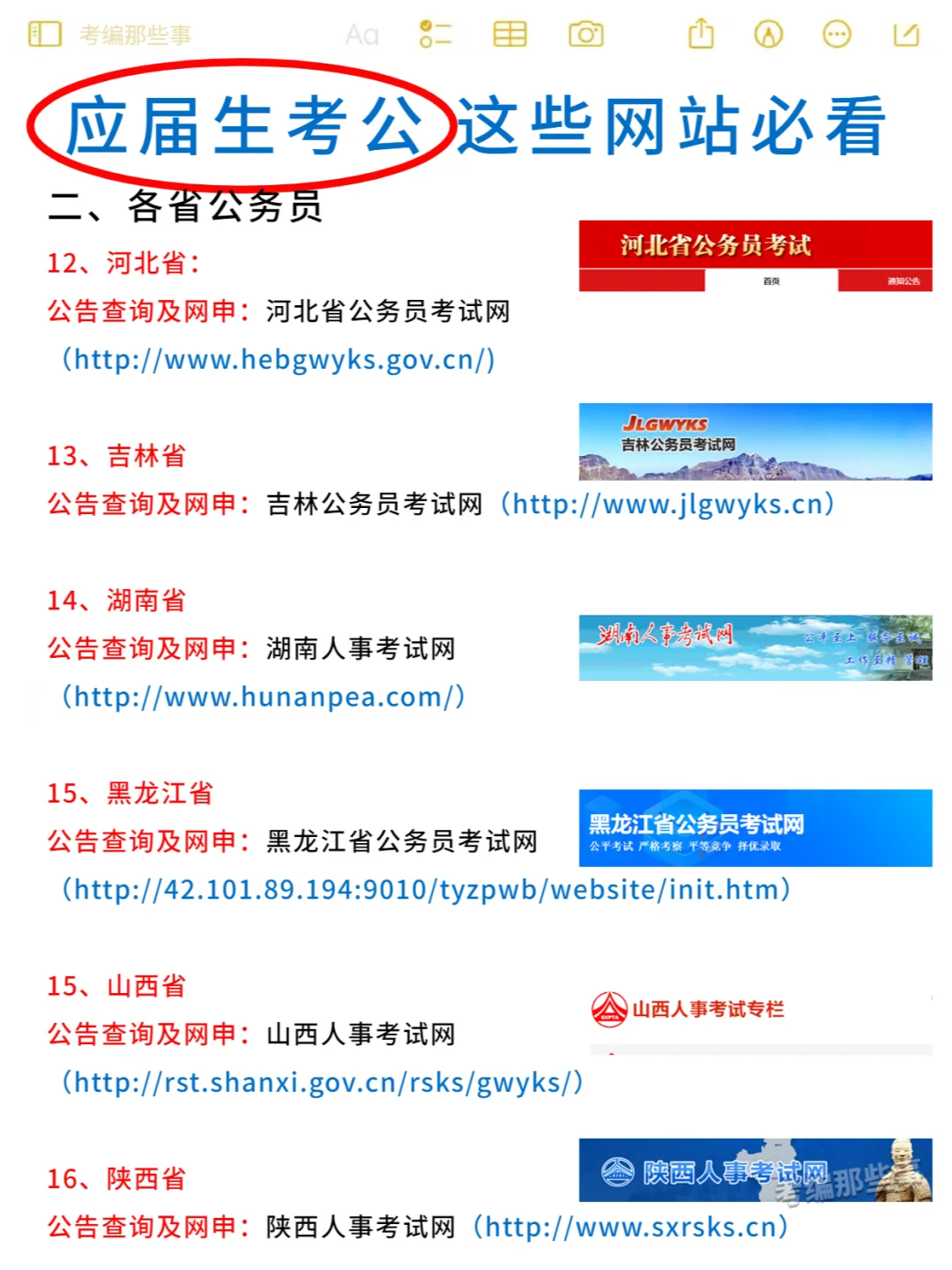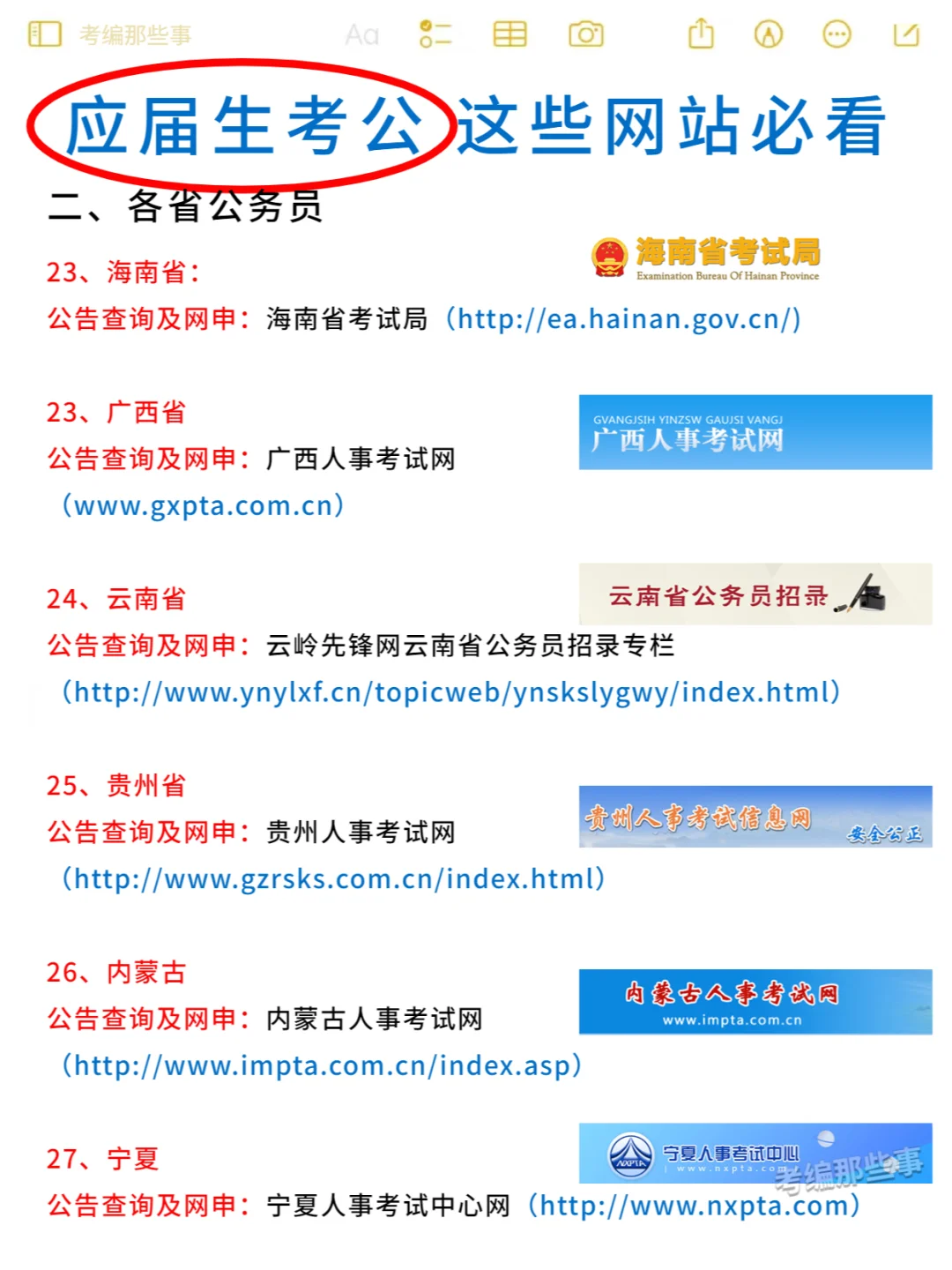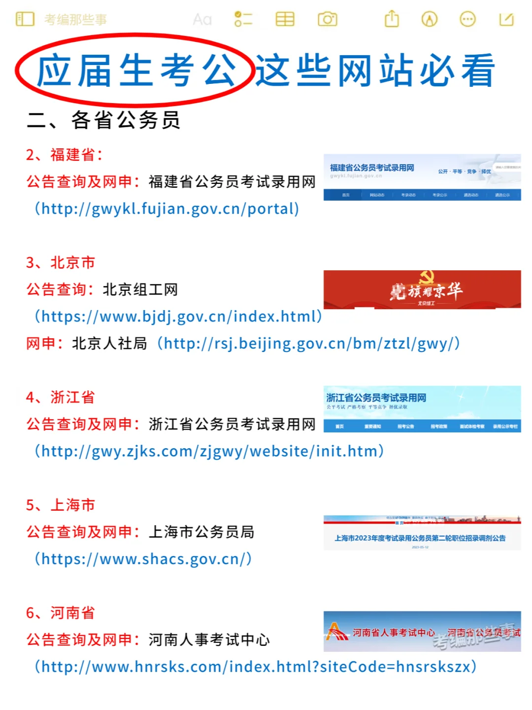 应届生考公需要看哪些网站,编编给你列出来了 ⭕⭕一、国家公务员 1、国家公务员局——考试录用专题 下半年的2024国考在这个网站发布公告、岗位信息、笔试通知、成绩、调剂、补录等消息。 2、国家税务总局——公务员招录栏 国考税务系统招考相关事项、面试、递补等相关通知发布 3、中华人民共和国海关总署 国考海关系统招考相关事项、面试、递补等相关通知发布 ⭕⭕二、各省公务员 1、广东省: 公告查询:广东人事考试网 网申:广东省公务员.考试录用管理信息系统 2、福建省: 公告查询及网申:福建省公务员.考试录用网 3、北京市 公告查询:北京组工网 网申:北京人社局 4、浙江省 公告查询及网申:浙江省公务员.考试录用网 5、上海市 公告查询及网申:上海市公务员局 6、河南省 公告查询及网申:河南人事考试中心 7、重庆市: 公告查询及网申:重庆市人社局 8、四川省 公告查询及网申:四川省人社局 9、天津市 公告查询及网申: 天津市人事考试网上报名公共服务平台 10、江苏省 公告查询:中共江苏省委组织部网站 网申:江苏省人社厅 11、辽宁省 公告查询及网申:辽宁人事考试网 12、河北省: 公告查询及网申:河北省公务员.考试网 13、吉林省 公告查询及网申:吉林公务员.考试网 14、湖南省 公告查询及网申:湖南人事考试网 ......具体如上