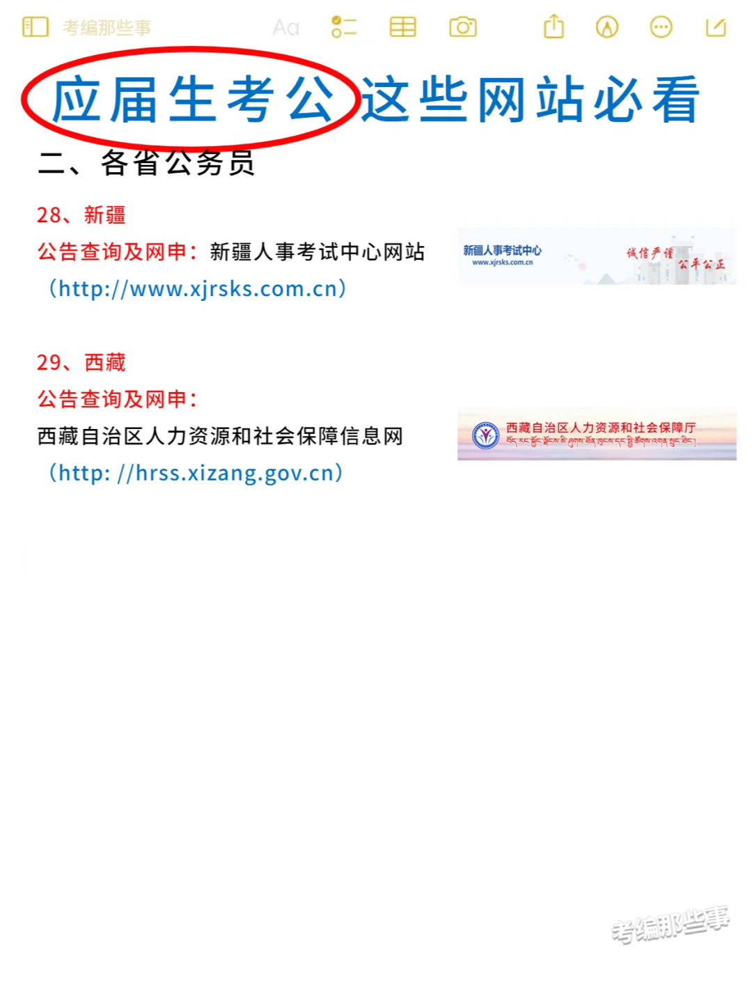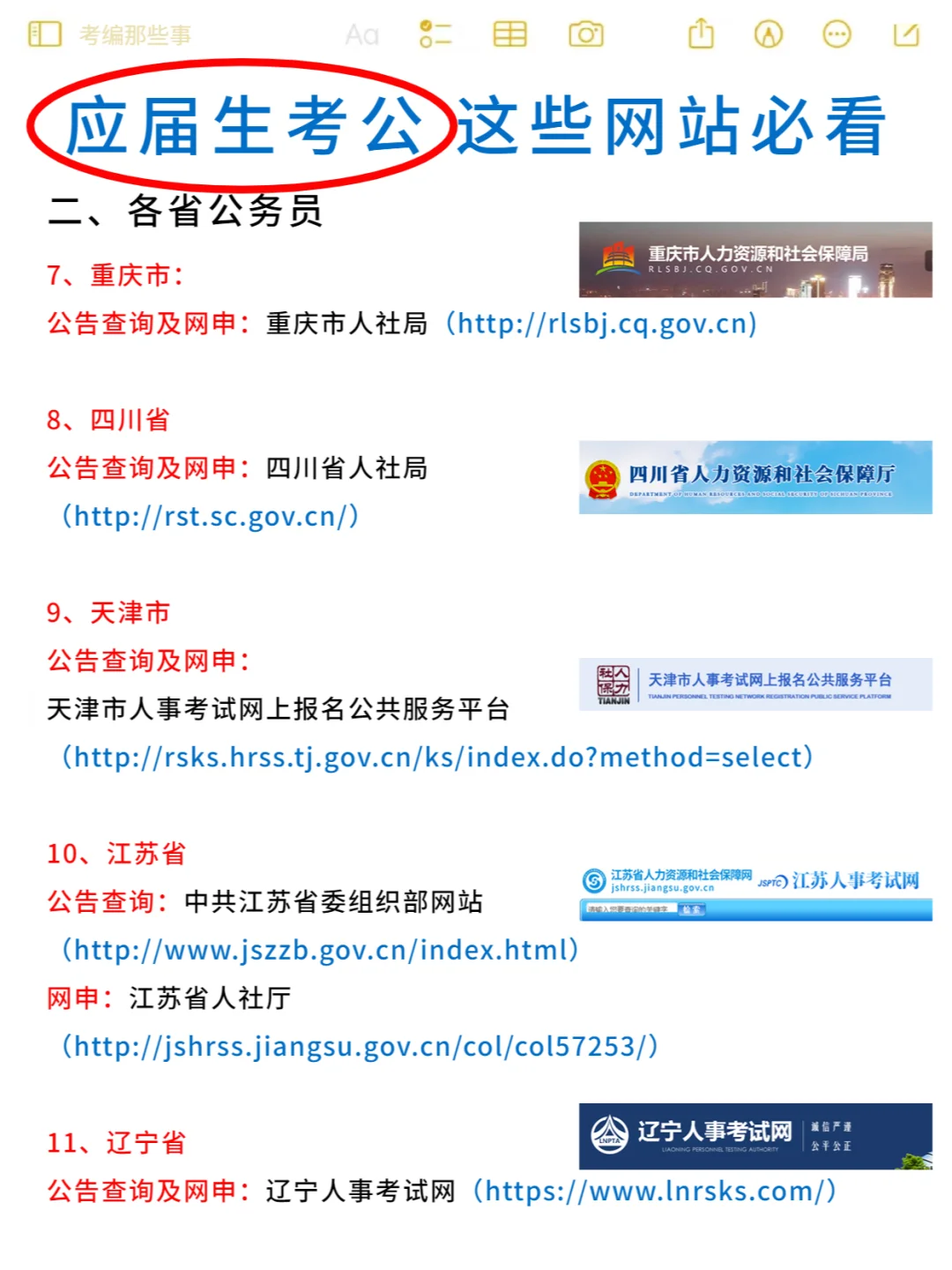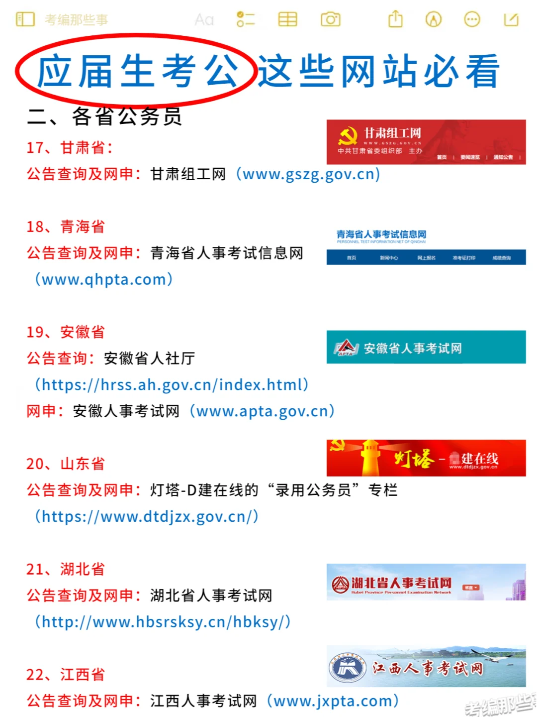 应届生考公需要看哪些网站,编编给你列出来了 ⭕⭕一、国家公务员 1、国家公务员局——考试录用专题 下半年的2024国考在这个网站发布公告、岗位信息、笔试通知、成绩、调剂、补录等消息。 2、国家税务总局——公务员招录栏 国考税务系统招考相关事项、面试、递补等相关通知发布 3、中华人民共和国海关总署 国考海关系统招考相关事项、面试、递补等相关通知发布 ⭕⭕二、各省公务员 1、广东省: 公告查询:广东人事考试网 网申:广东省公务员.考试录用管理信息系统 2、福建省: 公告查询及网申:福建省公务员.考试录用网 3、北京市 公告查询:北京组工网 网申:北京人社局 4、浙江省 公告查询及网申:浙江省公务员.考试录用网 5、上海市 公告查询及网申:上海市公务员局 6、河南省 公告查询及网申:河南人事考试中心 7、重庆市: 公告查询及网申:重庆市人社局 8、四川省 公告查询及网申:四川省人社局 9、天津市 公告查询及网申: 天津市人事考试网上报名公共服务平台 10、江苏省 公告查询:中共江苏省委组织部网站 网申:江苏省人社厅 11、辽宁省 公告查询及网申:辽宁人事考试网 12、河北省: 公告查询及网申:河北省公务员.考试网 13、吉林省 公告查询及网申:吉林公务员.考试网 14、湖南省 公告查询及网申:湖南人事考试网 ......具体如上