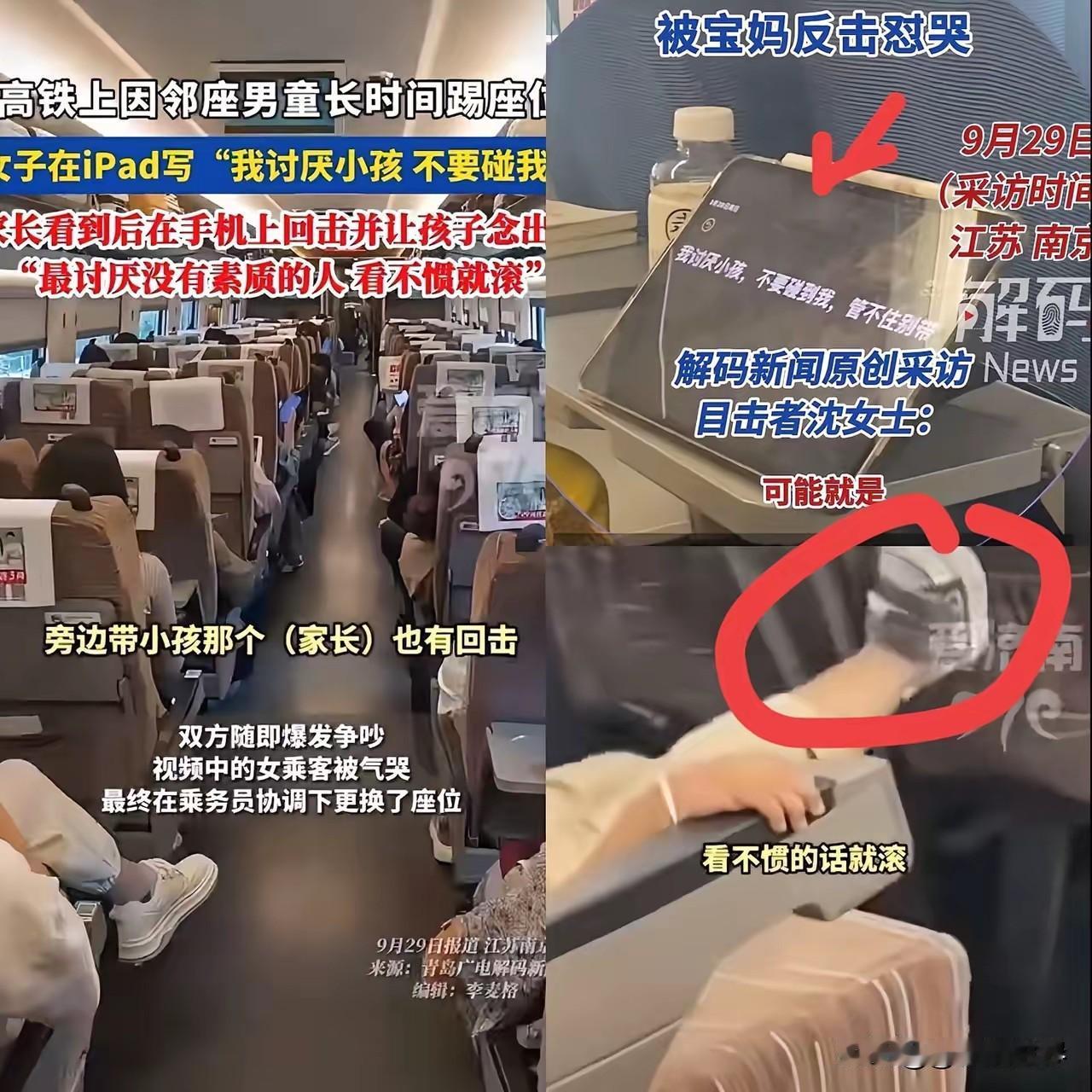 以其人之道,还治其人之身!高铁上,女乘客被邻座男童长时间踢座位,忍无可忍。于是她在平板上写下一行字,“我讨厌小孩,不要碰我,管不住别带”! 没想到这一举动激怒了男孩家长,于是在手机上打出“我最讨厌没有素质的人,看不惯就滚”,并让孩子大声念出这句话! 双方大吵一架,险些打起来。女乘客被气哭,最终由乘务员协调换到了别的座位。 女乘客被熊孩子打扰,表达诉求方式不可取。她可以找家长反映,或者找乘务员协调解决。冷冰冰的写在平板上,自己情绪得到了疏解,但是别人看起来的确很不舒服。 而这位家长就更过分了。本来就是自家熊孩子惹祸在先,别人表达不满,自己道个歉管管孩子不就完了吗?干嘛还要以牙还牙,让事态扩大化。 更过分的是,还让孩子读出来。就这样教育孩子吗?难怪孩子不讲文明,在公共场所捣乱。有其母必有其子!高铁脱鞋风波 高铁不文明图鉴 高铁低素质行为 高铁脱鞋被踢 地铁女子踹人 小孩高铁上吵闹 高铁文明礼仪