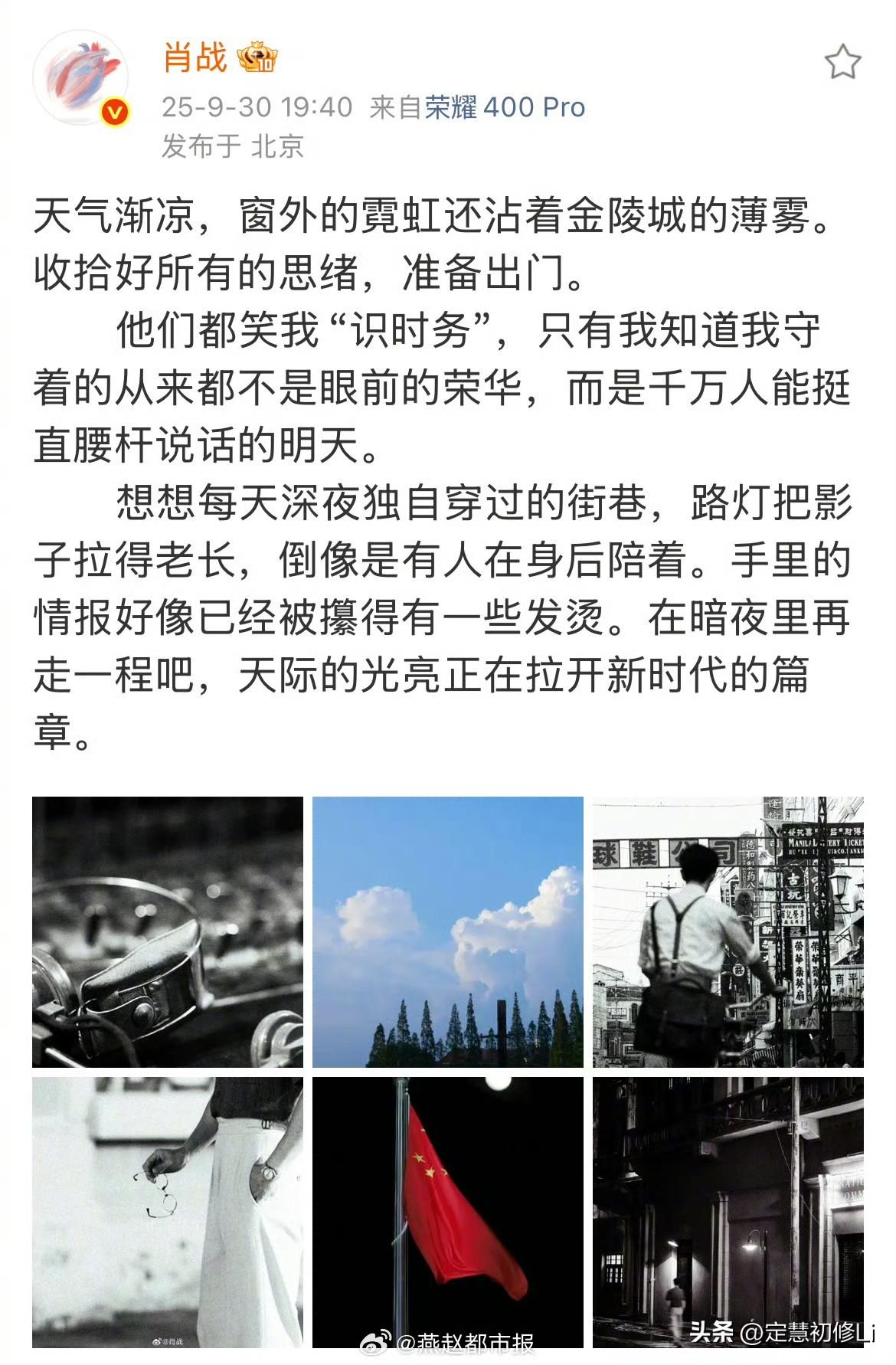 肖战《谍报上不封顶》杀青,肖战的杀青小作文也随即到达,肖战好懂角色,好懂任少白,角色遇到肖战是幸运的 “天气渐凉,窗外的霓虹还沾着金陵城的薄雾。收拾好所有的思绪,准备出门。他们都笑我“识时务”,只有我知道我守着的从来都不是眼前的荣华,而是千万人能挺直腰杆说话的明天。想想每天深夜独自穿过的街巷,路灯把影子拉得老长,倒像是有人在身后陪着。手里的情报好像已经被攥得有一些发烫。在暗夜里再走一程吧,天际的光亮正在拉开新时代的篇章。” 任少白:肖战,有你真好