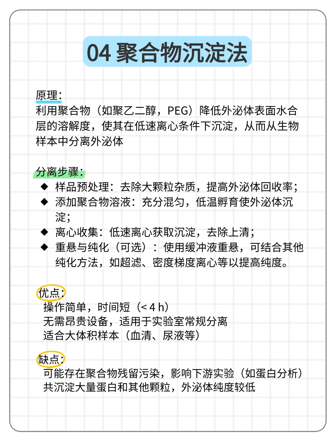 👉原理:利用聚合物(如聚乙二醇,PEG)降低外泌体表面水合层的溶解度,使其在低速离心条件下沉淀,从而从生物样本中分离外泌体