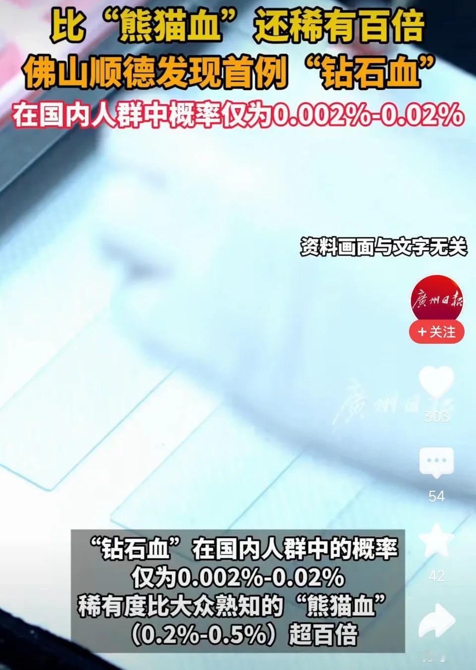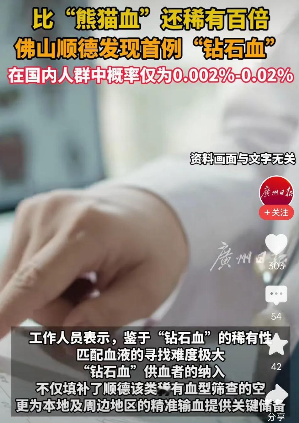 广东顺德发现一例“钻石血”,比“熊猫血”罕见百倍! 佛山市顺德区中心血站检验科筛查出一例稀有血型Jk(a-b-)——稀有度超“熊猫血”百倍的“钻石血”。 不懂就问: 熊猫血在需要手术时,都需要提前筹备血液储量,而且很难筹得! 这钻石血,如果得了病或者有外科手术,需要输血,他就输不上?就得等死? 广东顺德发现一例“钻石血”