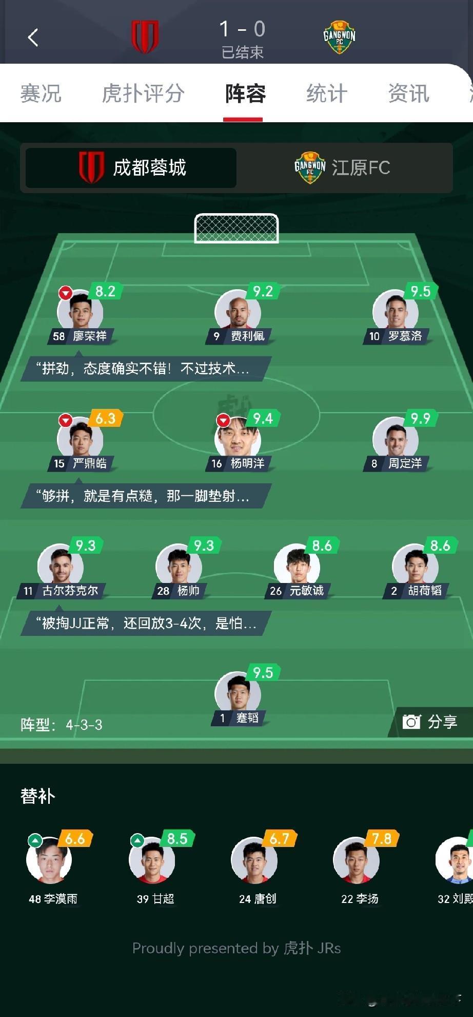 看来外战还得靠川军啊!周定洋一脚定乾坤!成都蓉城迎来队史亚冠首胜。 今天中超两队都没有添堵,一个踢平日本,一个踢赢韩国,两队踢得都很拼,都为国争光了! 不过有一说一,咱们跟日韩球队的差距确实明显,韩国江原派出的是全替补,后面直接上的二队球员,咱们成都全主力也踢的很吃力啊。 上港的对手广岛三箭就更不用多说了,要不是陈威发挥超神,早就被打花了。 所以,咱们中超的球员还得继续努力啊。 最后祝大家国庆节快乐!祝各位有个愉快的假期!