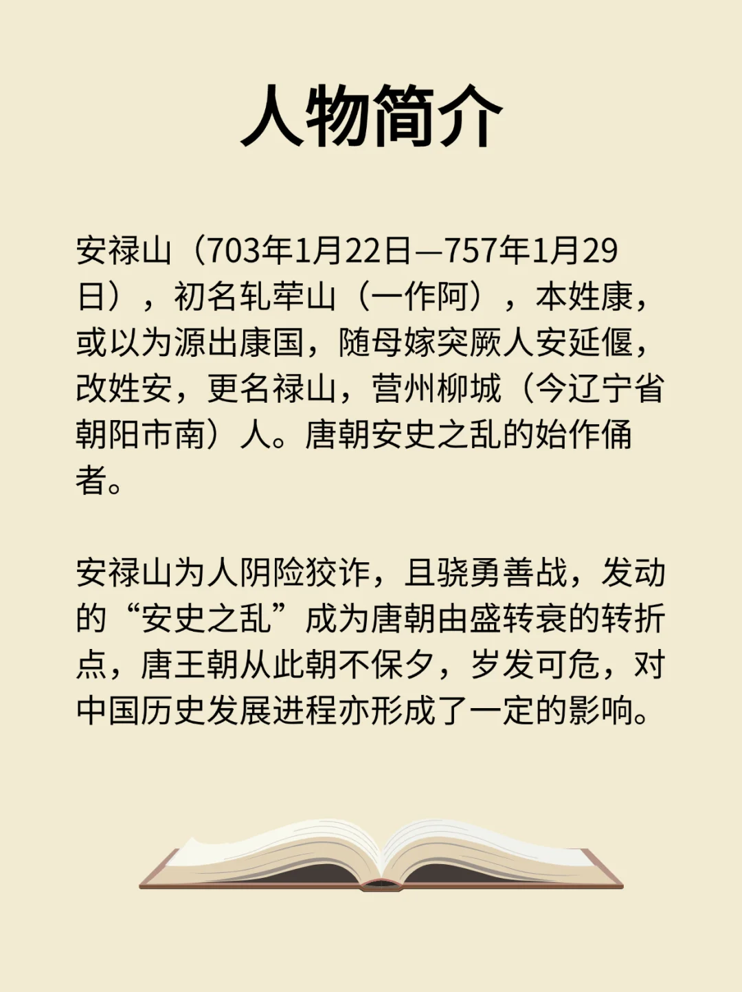 [向右R]安禄山(703年1月22日—757年1月29日),初名轧荤山(一作阿),本姓康,或以为源出康国,随母嫁突厥人安延偃,改姓安,更名禄山,营州柳城(今辽宁省朝阳市南)人。唐朝安史之乱的始作俑者。