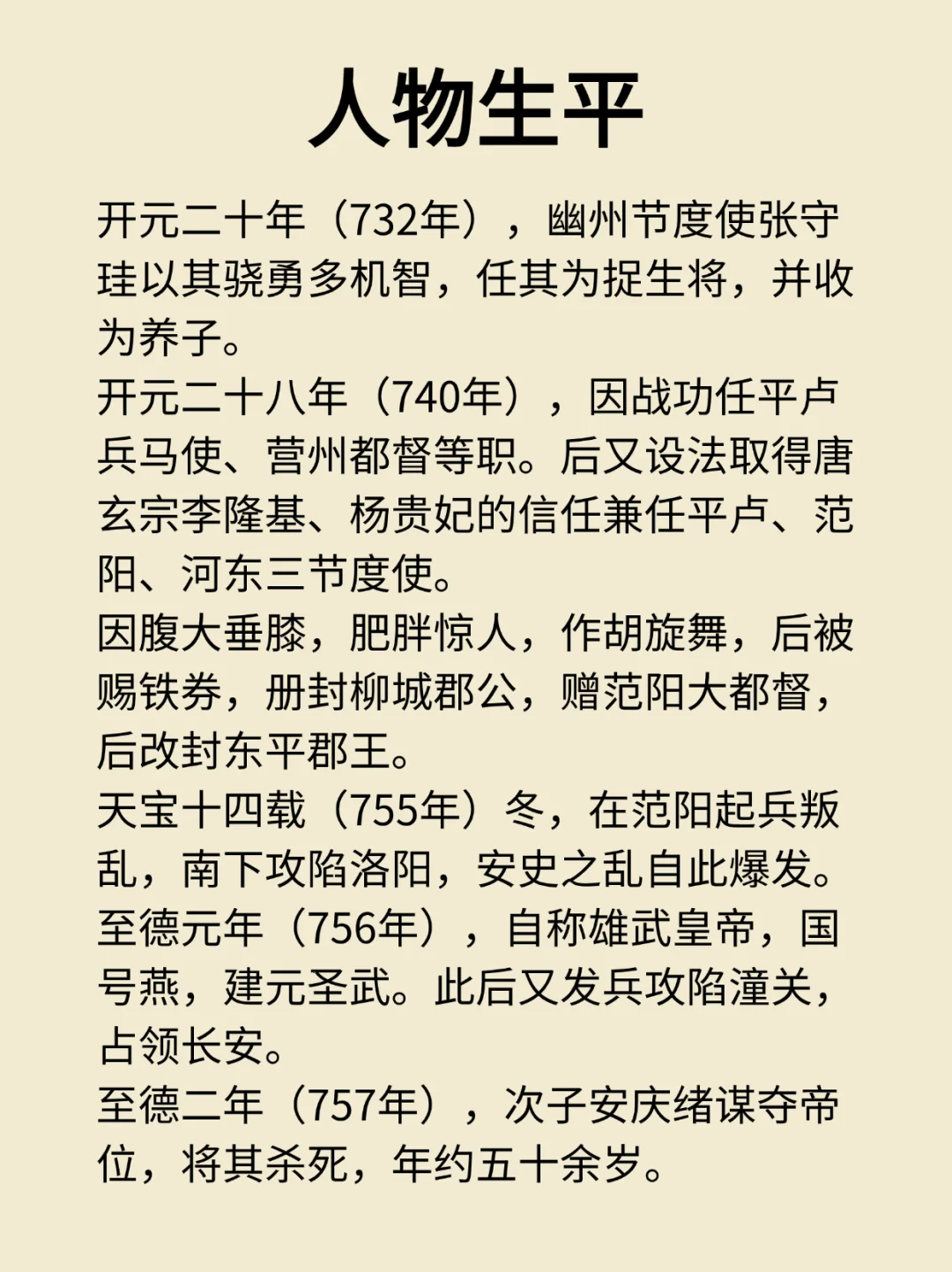 [星R]因腹大垂膝,肥胖惊人,作胡旋舞,后被赐铁券,册封柳城郡公,赠范阳大都督,后改封东平郡王。天宝十四载(755年)冬,在范阳起兵叛乱,南下攻陷阳,安史之乱自此爆发。