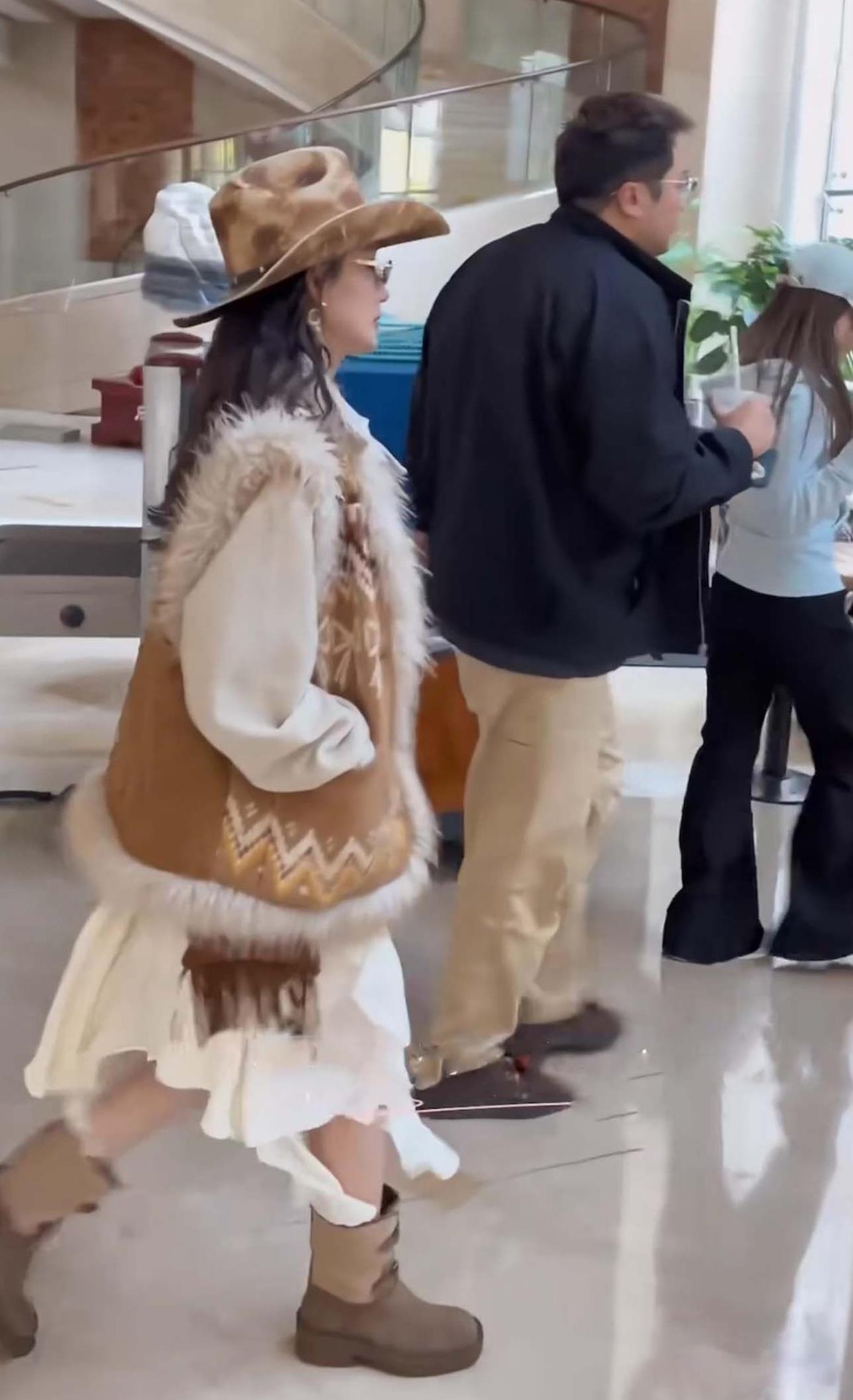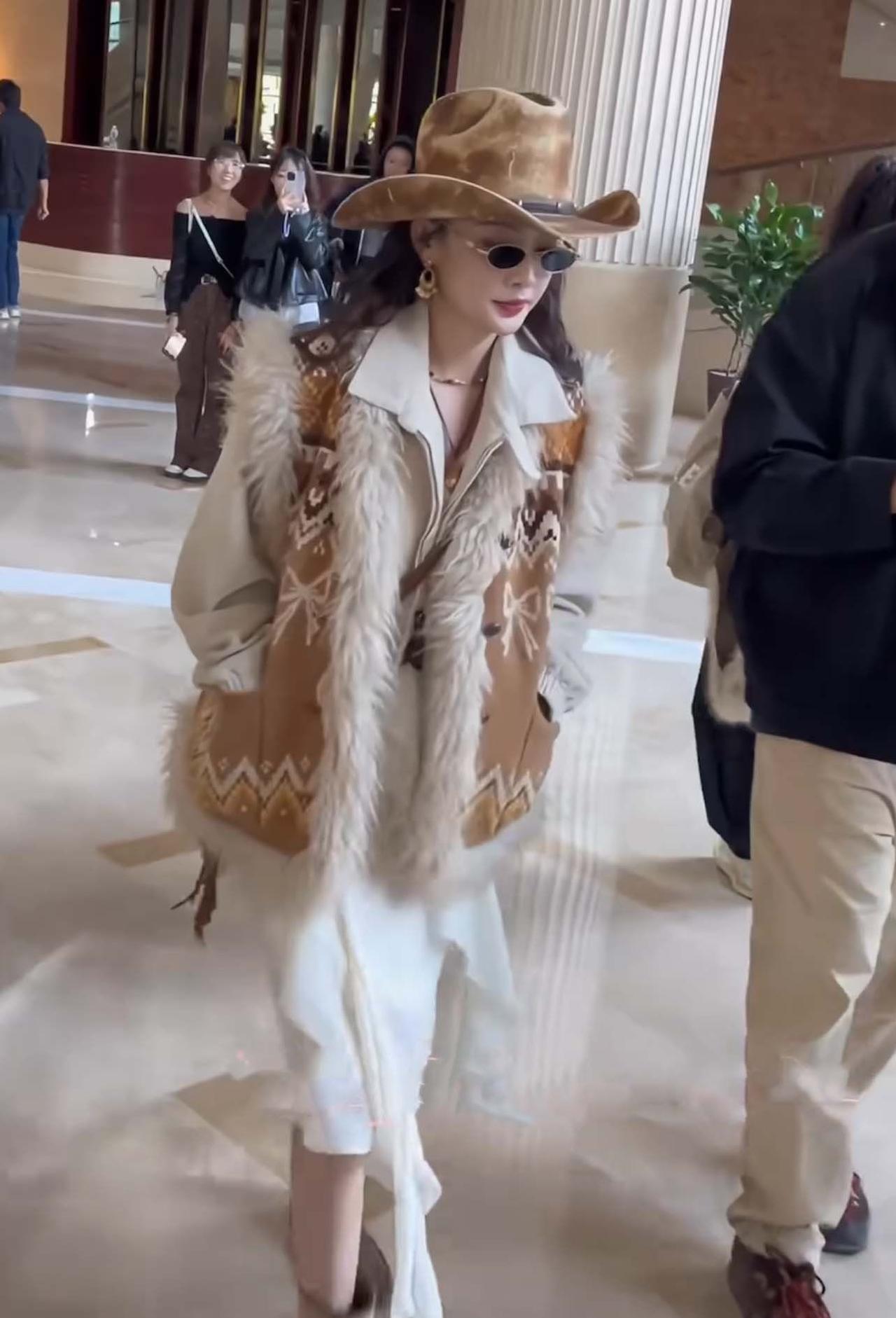 李沁今天变成贵妇了!穿得保暖还老有钱。 李沁9.30综艺打扮路透,这身造型着实显贵,毛绒马甲搭配裙子,再配上牛仔帽,又好看又显得很富贵,要竖大拇指了!