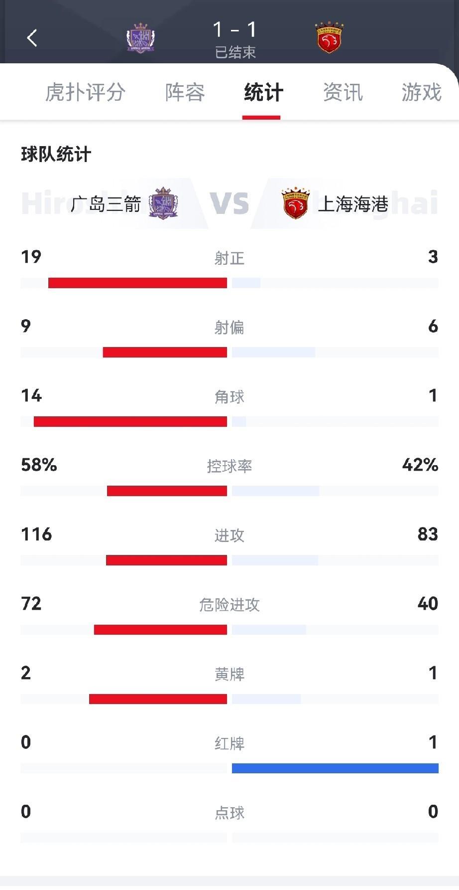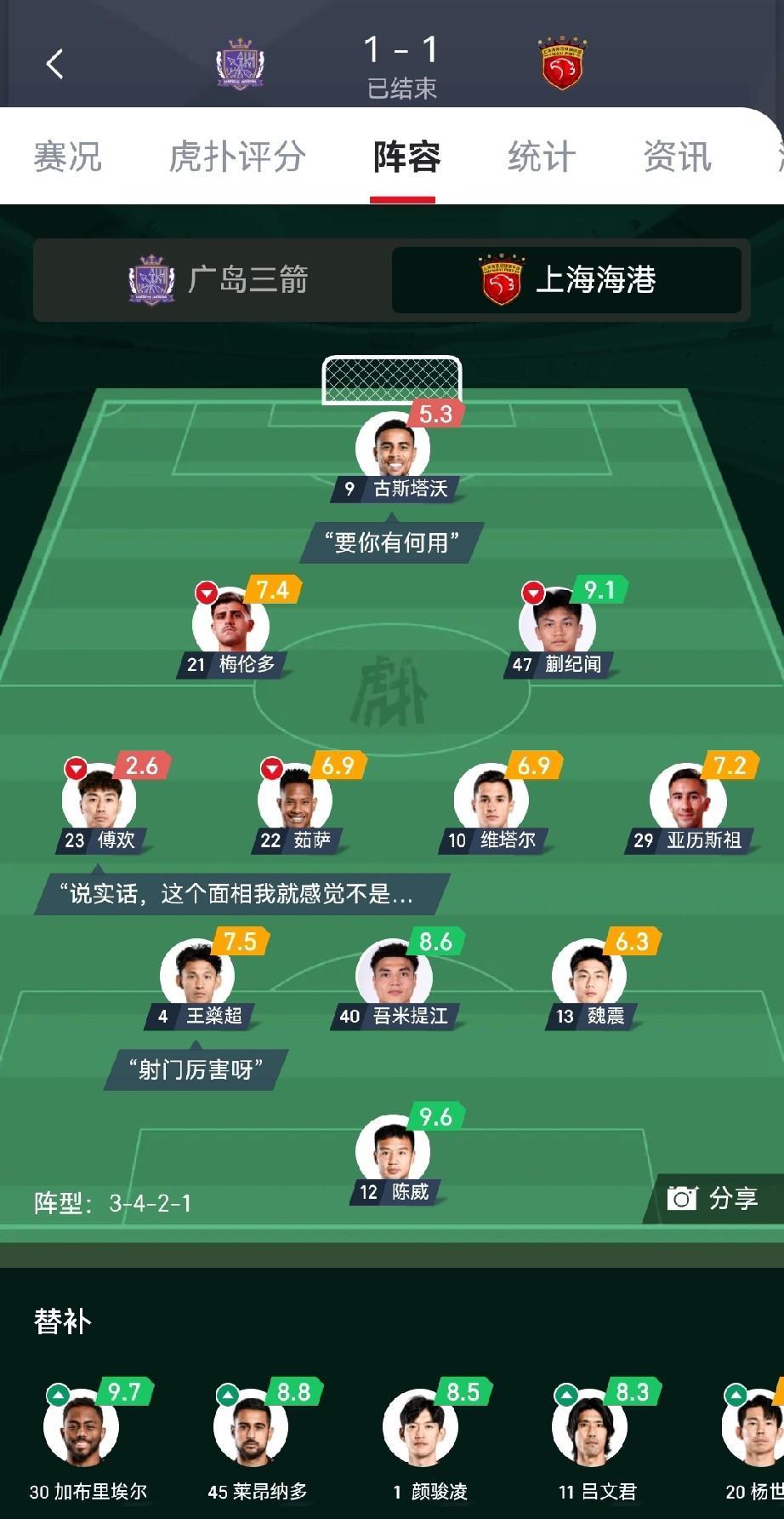 上海海港好样的!国庆打响抗日第一枪!陈威真乃门神也,加布里埃尔的进球太提士气了。 虽然正常比赛实力差距不小,上港全场被让压着打,但海港拼得不错!靠着外援个人能力跟门将神发挥带回一分,真的太不容易了。 话说陈威这么牛逼的门将为什么没有进国家队?这实力完全可以在上港和国家队踢首发了。 小日本子也是真丢人啊,主场作战靠裁判帮忙,也赢不了半主力的上港,实力也不咋地嘛。 另外古斯塔沃那个能属于红牌动作?这裁判也太黑了吧。