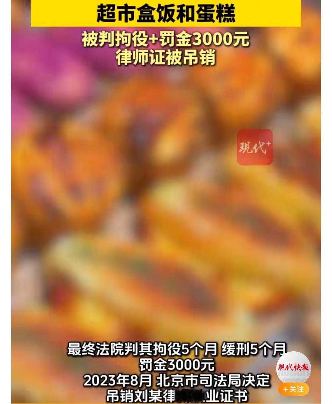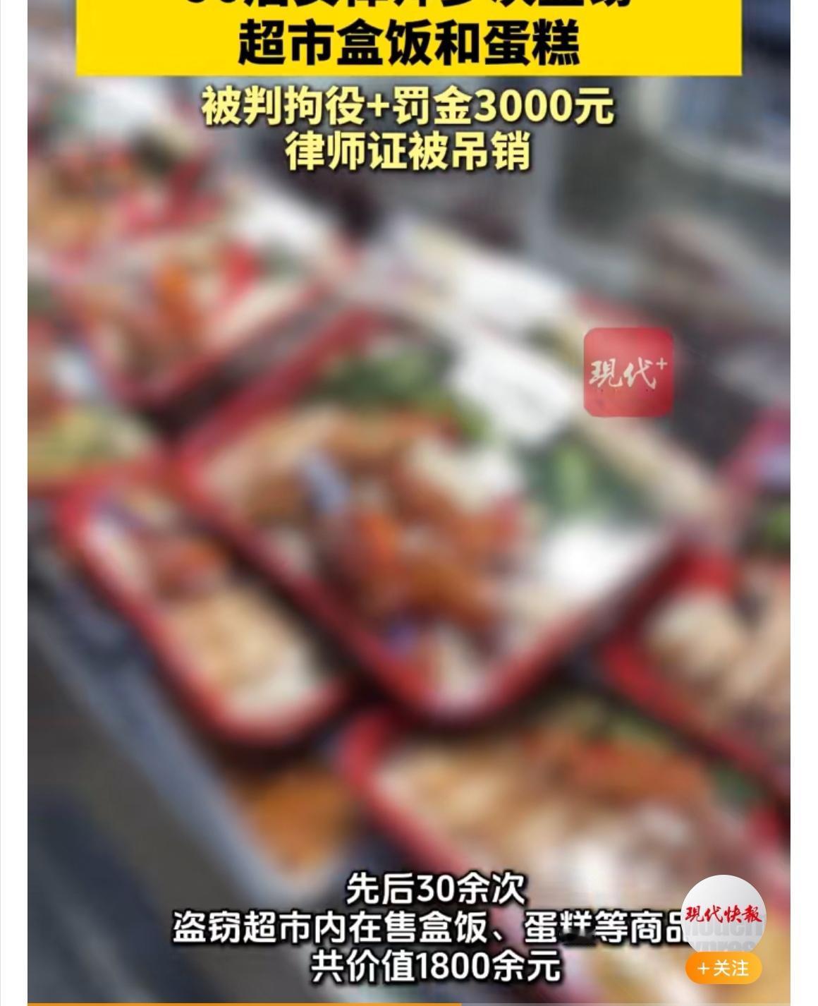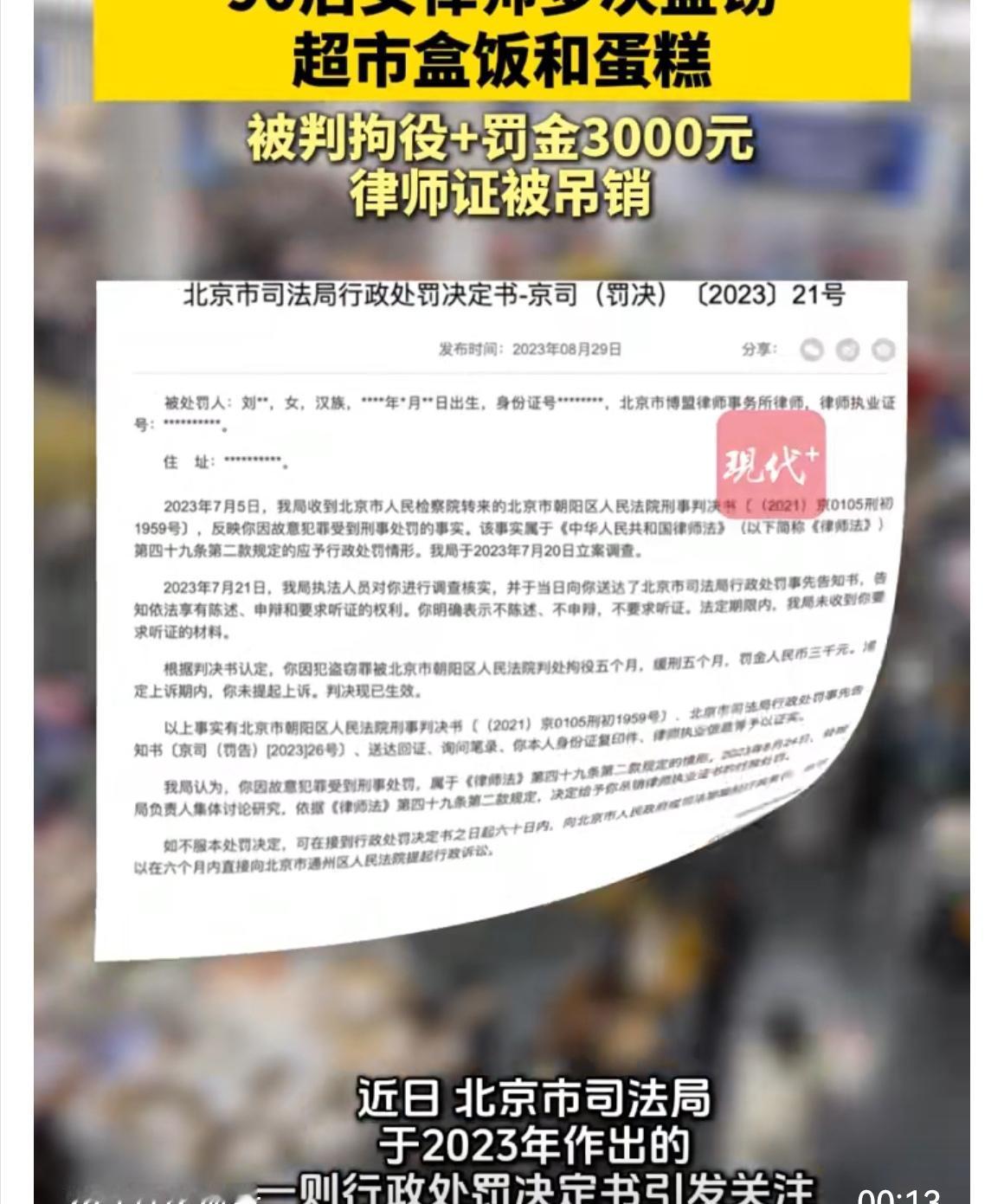 【新鲜出炉】北京90后女律师频偷超市盒饭蛋糕,律师证被吊! 北京一名90后女律师刘某,最近可真“整活儿”了。据悉,她利用熟谙法律的优势,居然在超市里频频上演“顺手牵羊”——短短时间内竟有30多次伸手,目标都是盒饭、蛋糕之类的小物,总价值刚1800多元,看起来好像没啥“大场面”。可别小看这操作,最终法院判她拘役5个月(缓刑),罚款3000元,最狠的是律师执业证直接给“办”了。 很多网友直呼“失去职业比罚的钱亏大发了!”毕竟金字招牌的律师身份,给人感觉本该是守护法律尊严的人。可刘某偏偏把法律知识“用错了地”,不禁让人唏嘘,本该用知识赢得尊重,结果却把前途亲手作废。这场“超市大冒险”,结局却变成法庭上的“自毁长城”。 事情发酵后,有人说刘某可能心理压力大,也有人怀疑她是为了刺激寻求快感,甚至顺手成瘾。无论如何,知法犯法带来的代价远超小利,你怎么看?如果你是当事人,会选择自首、求助、还是隐忍过去?评论区等你来畅聊!
