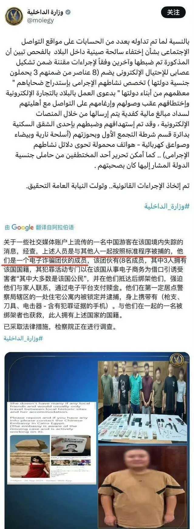 21岁中国女孩池某某的埃及之旅,从失联到被捕,剧情反转得让人猝不及防。9月26日晚她失联的消息引发关注,27日打听到下落,30日埃及内政部通报,她竟隶属于一个8人电诈团伙,其中有3名中国人。 该团伙以电商工作为诱饵,绑架同胞索要赎金。警方在公寓将他们一网打尽,还查获枪支等凶器和证据手机,同时解救了一名被绑架者。池女士闺蜜曾说她想旅居埃及,谁能想到她竟卷入跨国诈骗案。出国在外,一定要坚守底线,别让一时的贪念毁了自己。