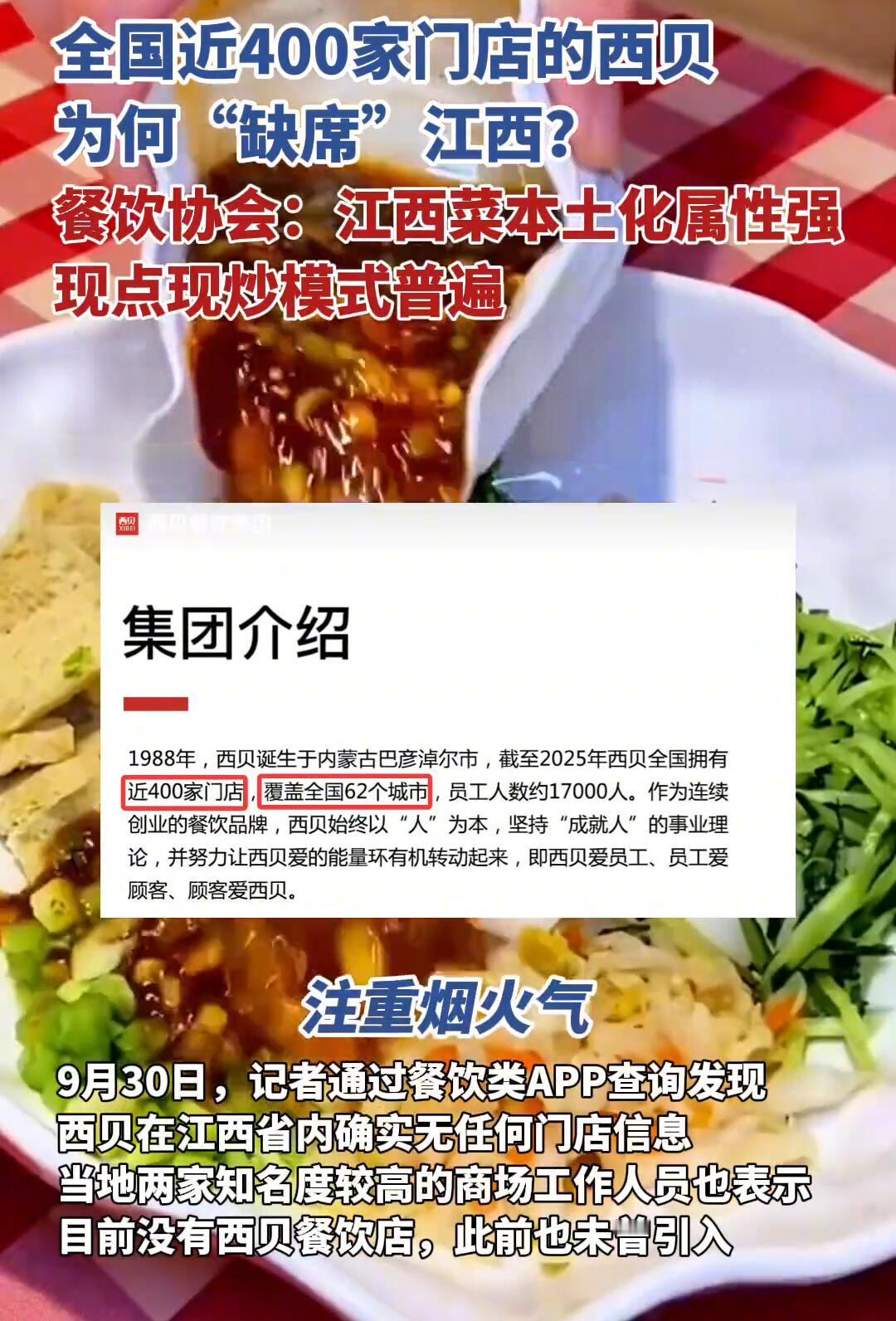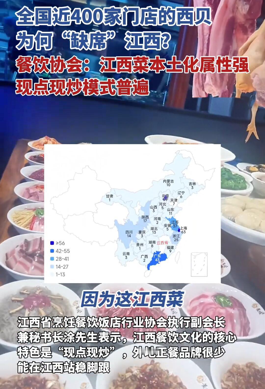 西贝为啥偏偏绕开江西?一句话:水土不服。 原因很简单: - 口味对不上:西贝偏咸香醇厚,江西人要的是“直击天灵盖”的辣。 - 模式不合拍:江西流行“明档现炒”,讲究锅气;西贝被吐槽“预制菜”,火味不够。 - 价格不划算:西贝人均80+,江西40元就能三菜一汤,性价比差距太大。 - 本土太强势:从3元拌粉到季季红火锅,本地品牌已经把高中低端全占了。 那西贝还有机会吗?难,但不是没可能。 - 先做“小而精”的测试店,主打现炒明档,口味“赣化”,价格亲民。 - 别端着西北架子,用本地食材做融合菜,比如藜蒿炒牛肉、瓦罐汤配莜面。 - 营销要接地气,跟本地博主联动,主打“锅气+性价比”。 - 别想着一口吃成胖子,先拿下南昌、赣州,再慢慢扩张。 说到底,江西人吃饭认的是“现炒、够辣、不贵”。谁能做到这三点,谁就能在这片江湖里站住脚。