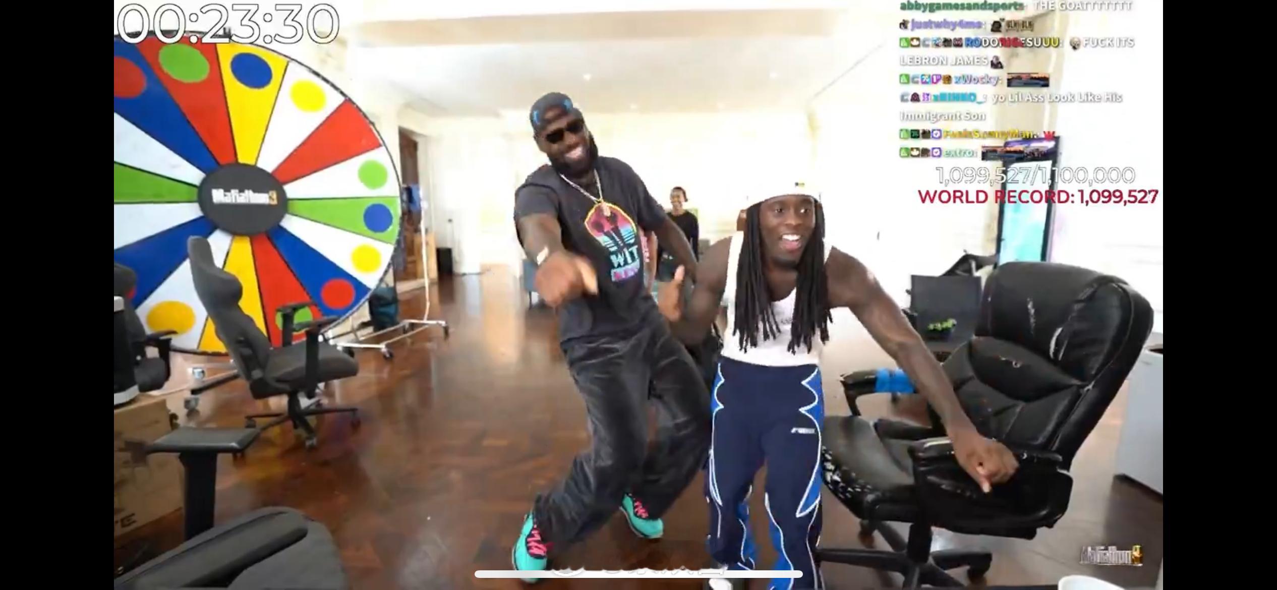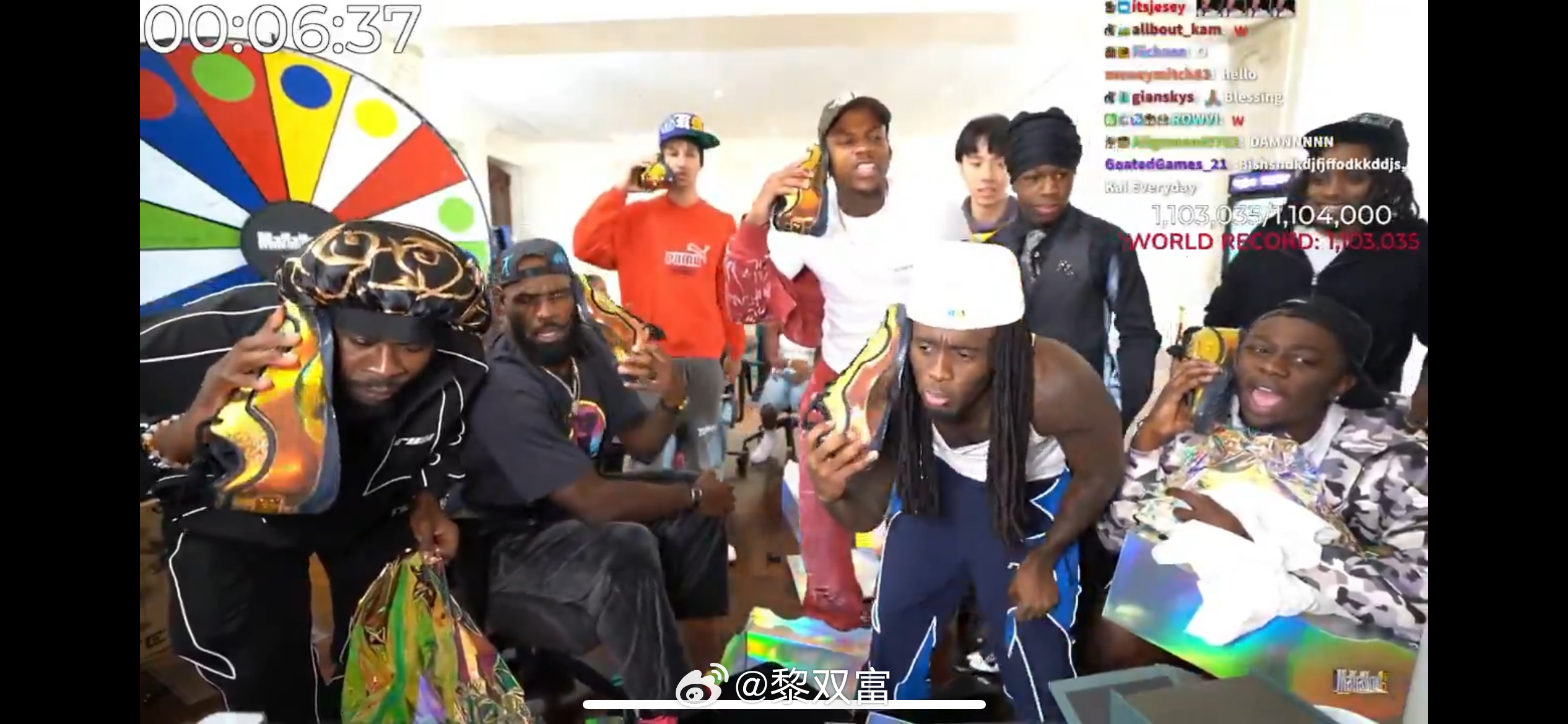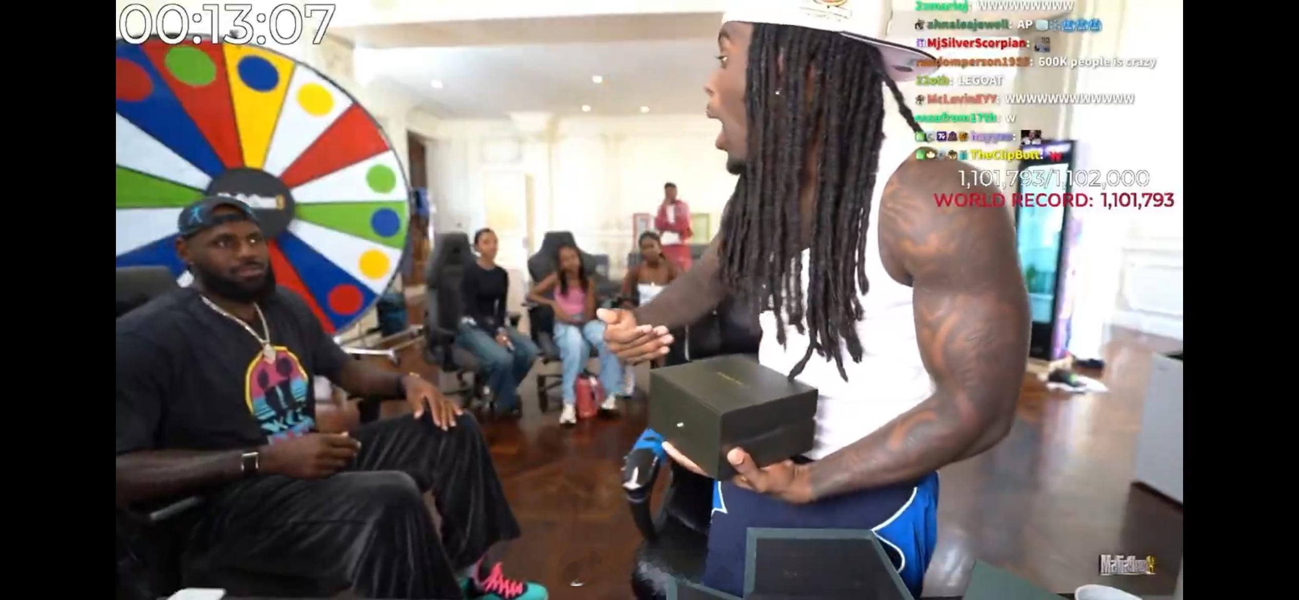 詹姆斯做客网红博主Kai Cenat直播间玩嗨了,还给对方送了一块价值20万美元的表,以及全体工作人员人手一双的金色23代球鞋。