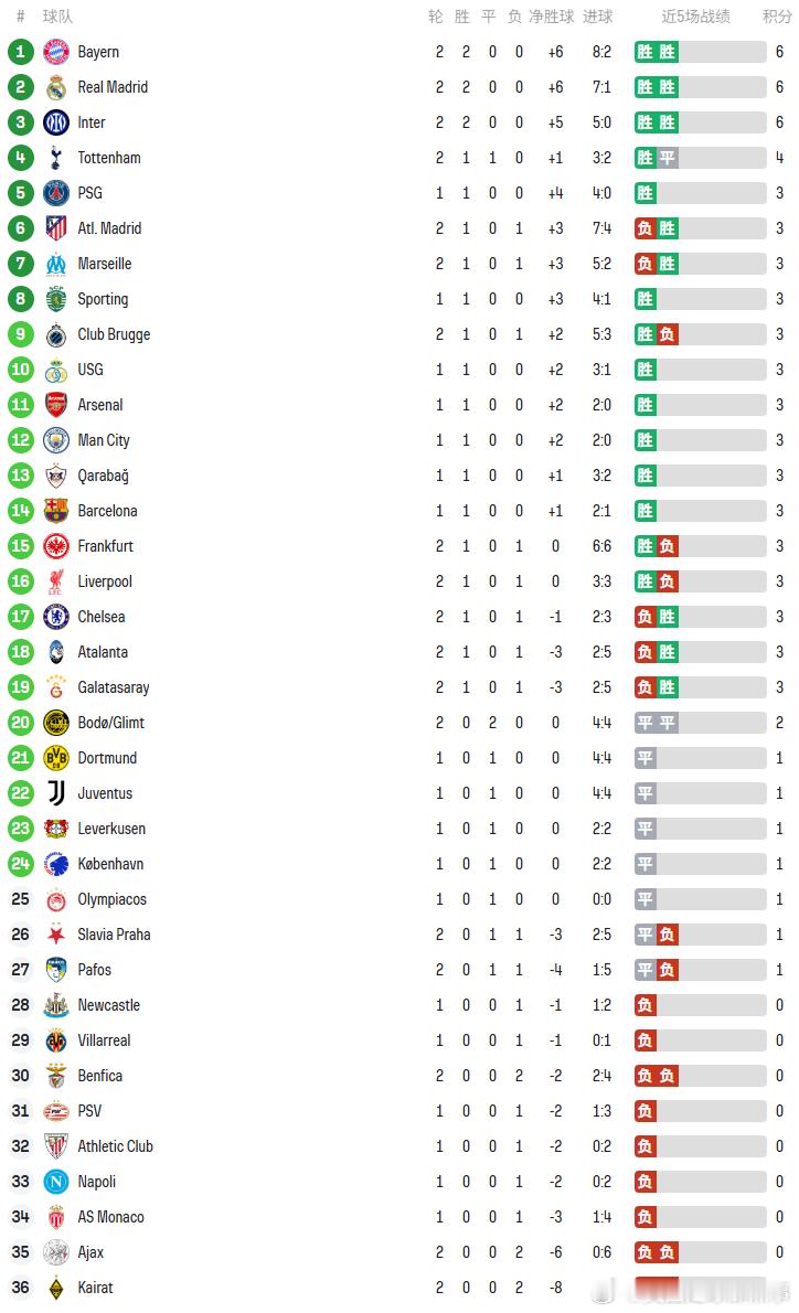 🔘 拜仁、皇马、国米暂全胜领跑