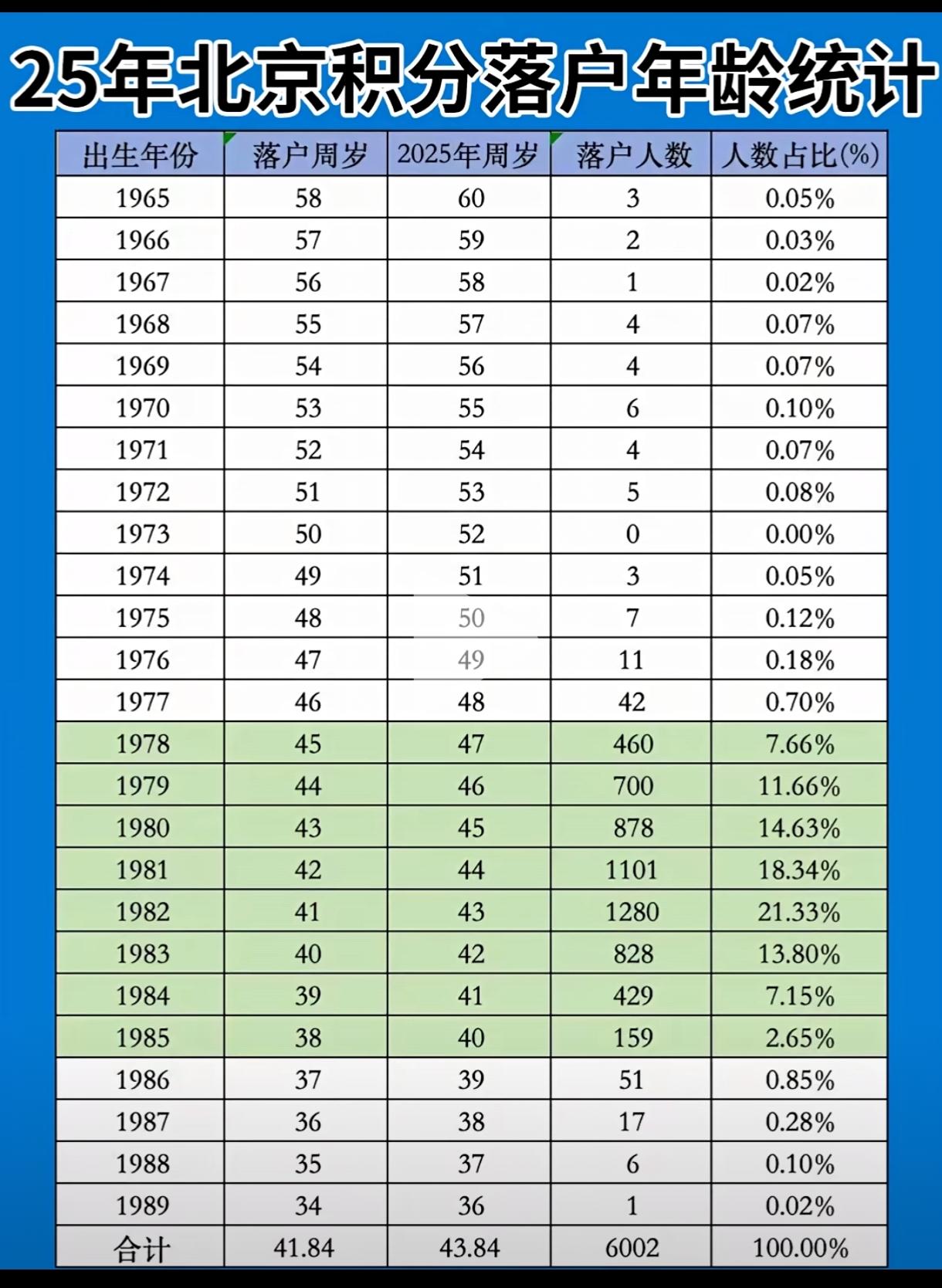 北京积分落户年龄分布,40岁是高峰扎堆人群,晚婚晚育的还有价值! 根据数据,近四年北京积分落户最低分数如下: - 2025年:117.33分, - 2024年:114.46分, - 2023年:109.92分, - 2022年:105.42分。 看出来了没,积分增长是越来越乏力了,后续增加幅度会下降。 从2025年北京积分落户年龄统计来看,落户人群集中在1978-1983年出生的群体,其中1982年出生(41周岁)的落户人数最多,达1280人,占比21.33%;1981年出生(42周岁)的有1101人,占比18.34%;1980年出生(43周岁)的有878人,占比14.63%;1979年出生(44周岁)的有700人,占比11.66%;1978年出生(45周岁)的有460人,占比7.66%。 而年龄偏大(如1965-1977年出生)或偏小(如1984年后出生)的群体落户人数和占比显著降低,整体呈现出以38-45周岁为核心落户年龄段的分布特征。 为什么会这样? 这一分布主要源于积分落户政策对年龄、学历、社保、纳税等维度的综合考核:38-45周岁的群体通常在京工作年限较长,社保缴纳、纳税积累更充分,同时具备较成熟的职业发展背景(如学历、职称、技能证书等加分项更易达标),综合积分竞争力强;而年龄偏大群体可能因年龄分抵扣、职业发展放缓等因素积分不足,年龄偏小群体则因在京积累时间短,社保、纳税、社会贡献等加分项尚未充分满足政策要求。 那么,后续排队的人群应注意些什么? 首先,还是积累核心加分项:尽早规划社保(保持连续缴纳)、纳税(合理合规提升纳税额),积极考取高学历、职称证书或技能等级证书,参与社会服务(如志愿服务、公益捐赠)以增加积分。 要关注政策动态:北京积分落户政策可能调整,需及时了解最新细则,针对性调整自身规划(如新增加分项的准备)。 如果年龄处于30-38周岁区间,需加快各项加分项的积累速度,在进入核心落户年龄段前尽可能提升积分,避免因年龄增长导致积分竞争力下降。