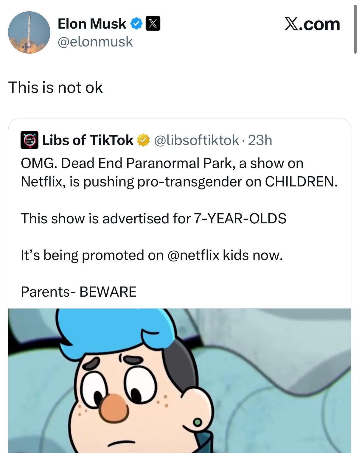 埃隆·马斯克宣布取消了他的网飞Netflix 账户。此前该平台被曝光正在播放一档由他/他们制作的节目,名为“Dead End Paranormal Park”,该节目针对 7 岁儿童,向儿童灌输支持跨性别的意识形态。 “我是跨性别者,”剧中角色说道。 早几年前,马斯克的大儿子通过变性手术成为女儿身,这是两人关系决裂。