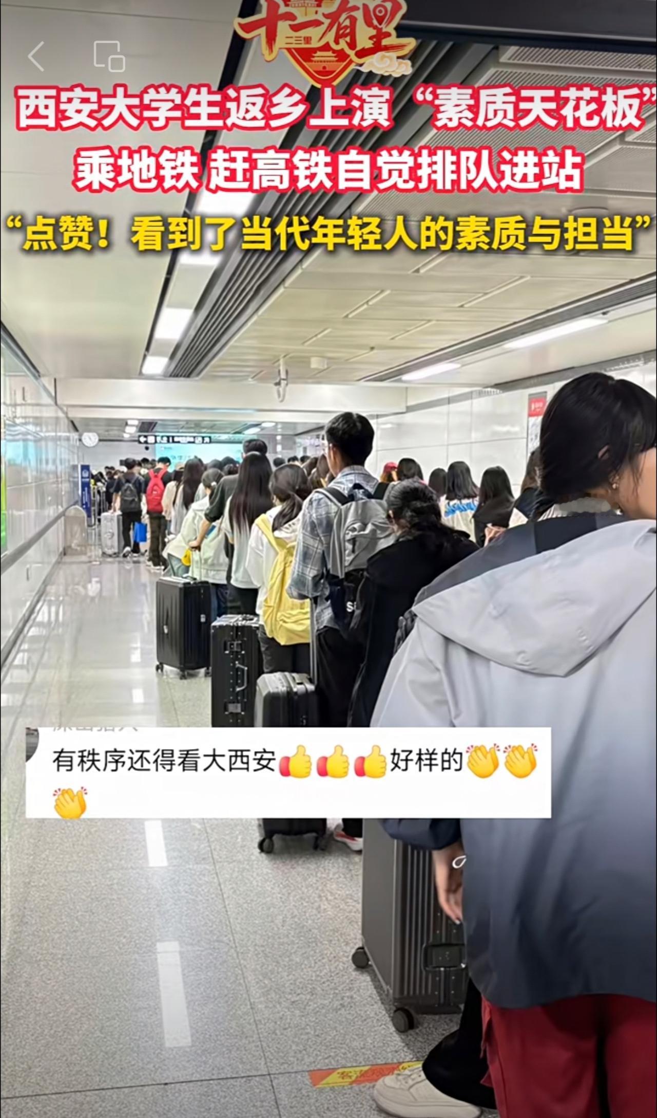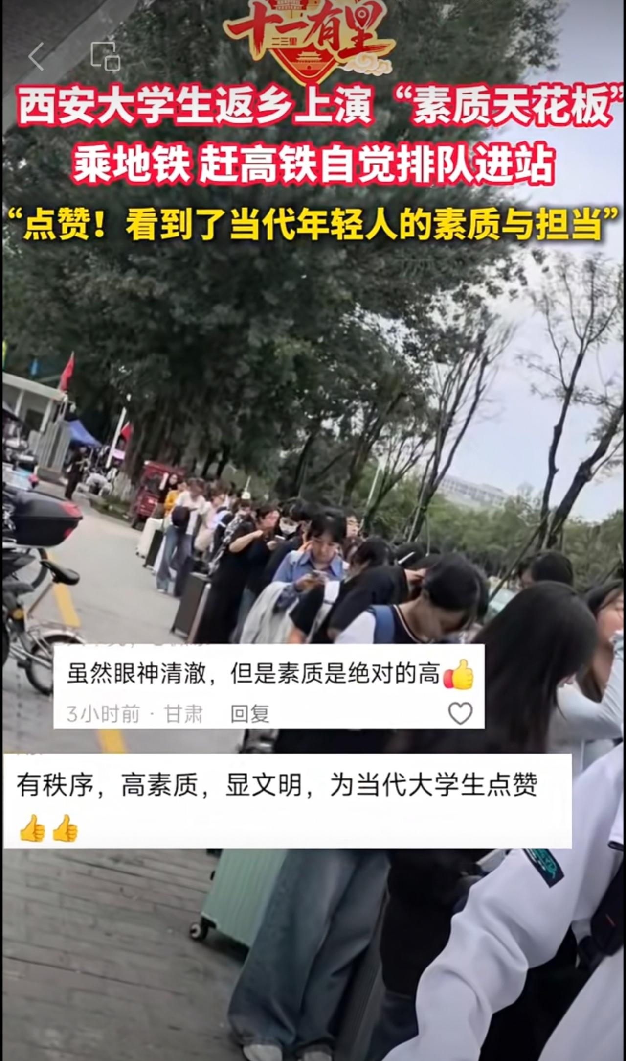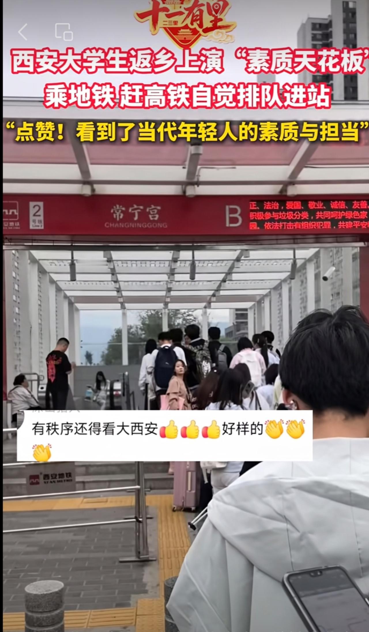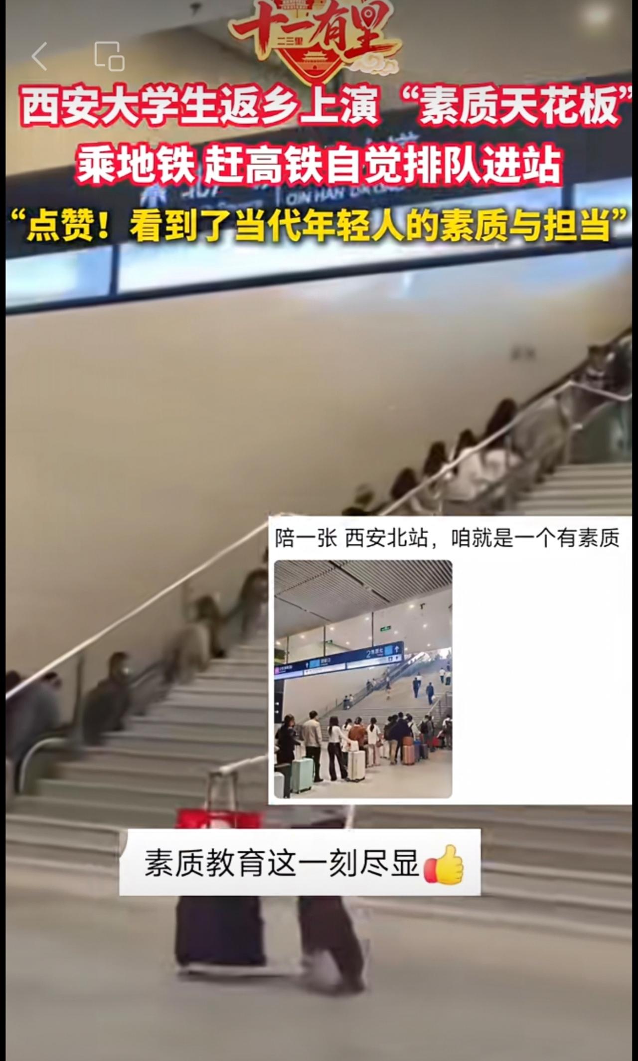 国庆假期开启,西安多所大学生乘地铁去北客站返乡,乘梯排队规整无插队,网友赞其有素养,称这些孩子有素质、有秩序,为当代大学生点赞