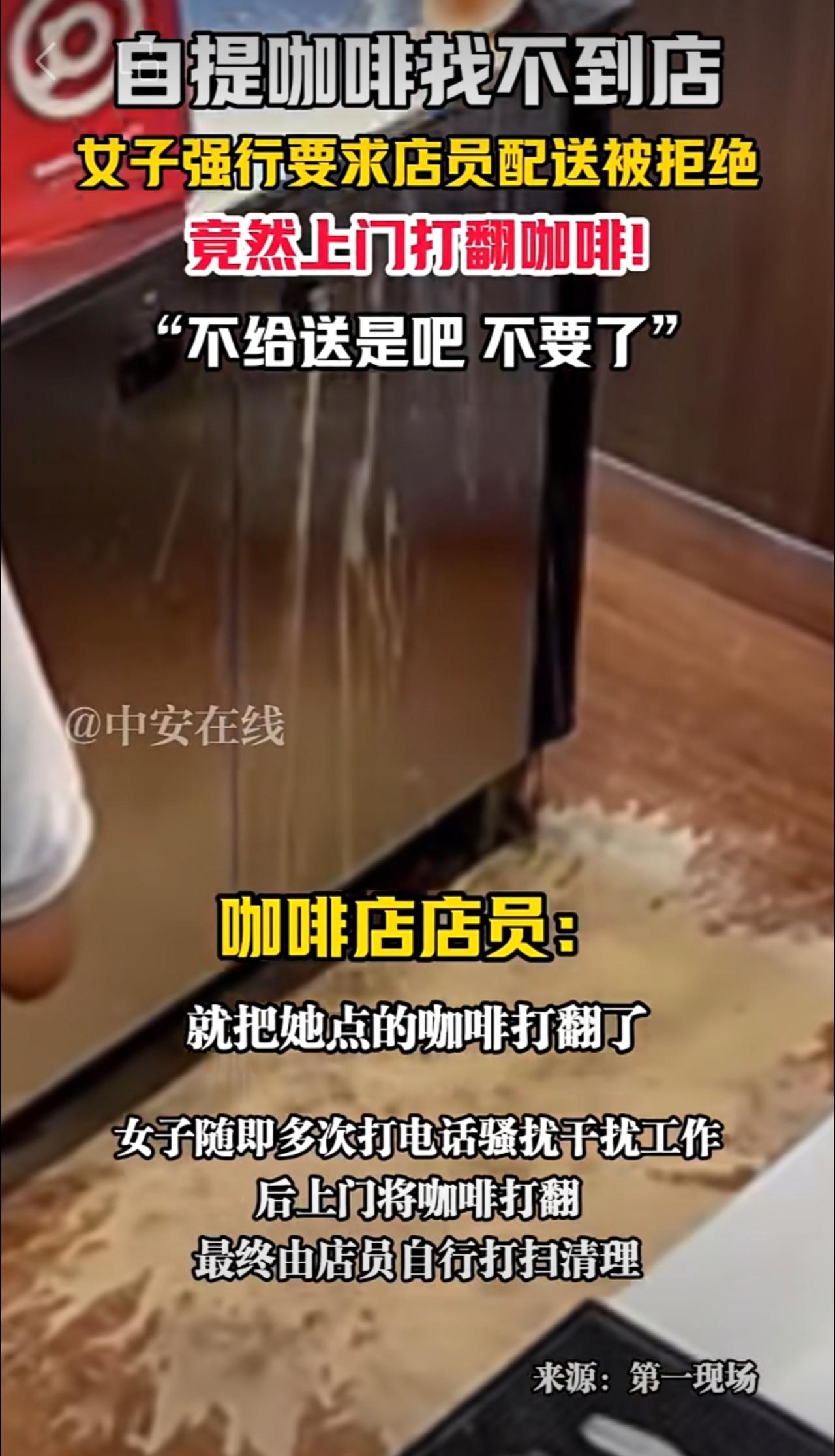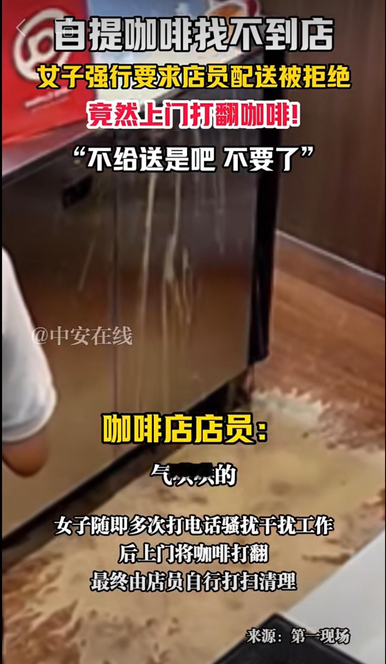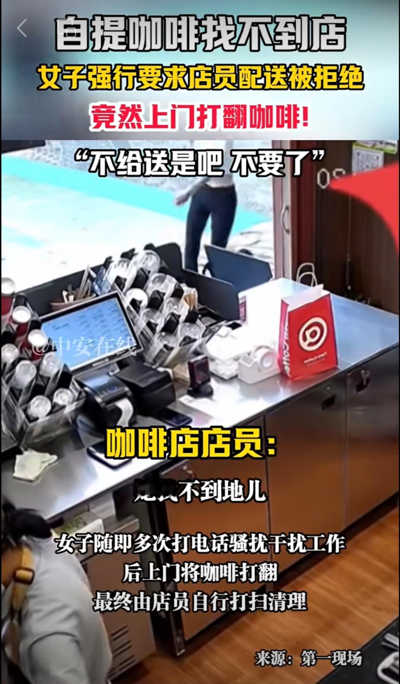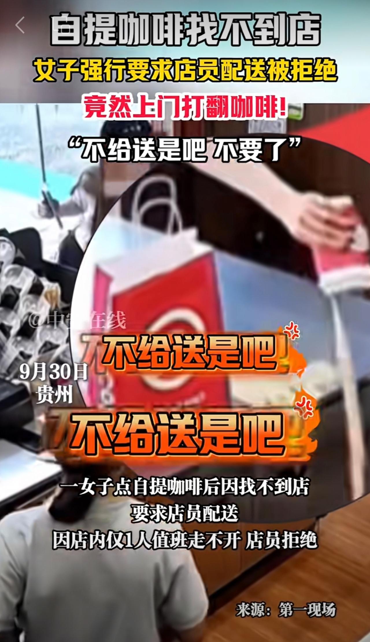 9月30日贵州,自提咖啡找不到店,女子强行要求店员配送被拒绝,竟然上门打翻咖啡!