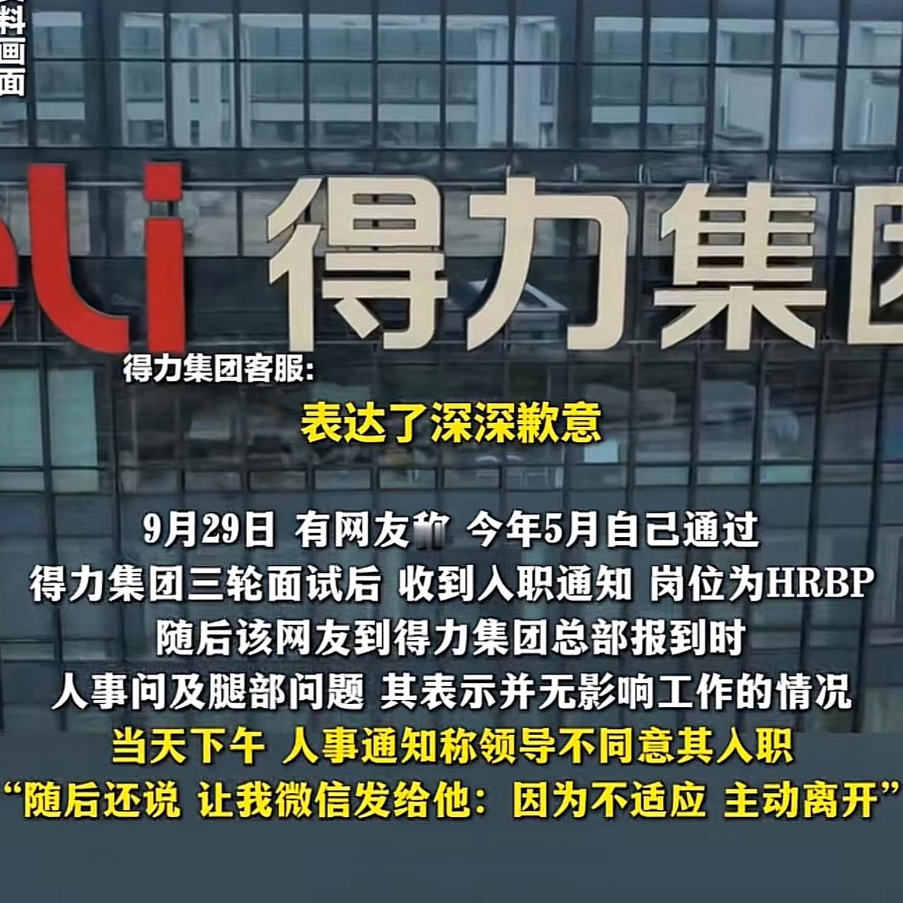 “得力的这次公关危机,堪称行业楷模”,近期一位应聘上得力集团HRBP岗位的腿部残疾员工,入职总部当天因其某位领导觉得该员工腿部有残疾故而不同意入职,随后人事通知让这位员工以因为“工作不适应”主动离开。事件曝光后得力CEO第一时间致歉,并且已经成立内部专项调查小组积极核查。应该说得力没有回避问题,积极接受公众的批评并且重申自己企业对待社会责任的价值观值得尊重和点赞👍,残疾人和正常人之间本身就有一样的工作权利和岗位权利。我们可以看到诸如苹果、特斯拉、等世界级的企业在我们国家都有专门设置残疾人岗位,许多残疾人员工享受到和正常员工一样的薪酬待遇。得力可能个别管理层也是好心办坏事,简单的认为残疾员工会影响自己公司的形象,似乎站在这个角度也能理解,但是作为一家国际知名的办公用品企业,社会责任,帮扶困难群体,本身也是对企业自身的口碑提高,绝不能顾此失彼!祝福这位小姐姐,希望后续能正常入职得力。